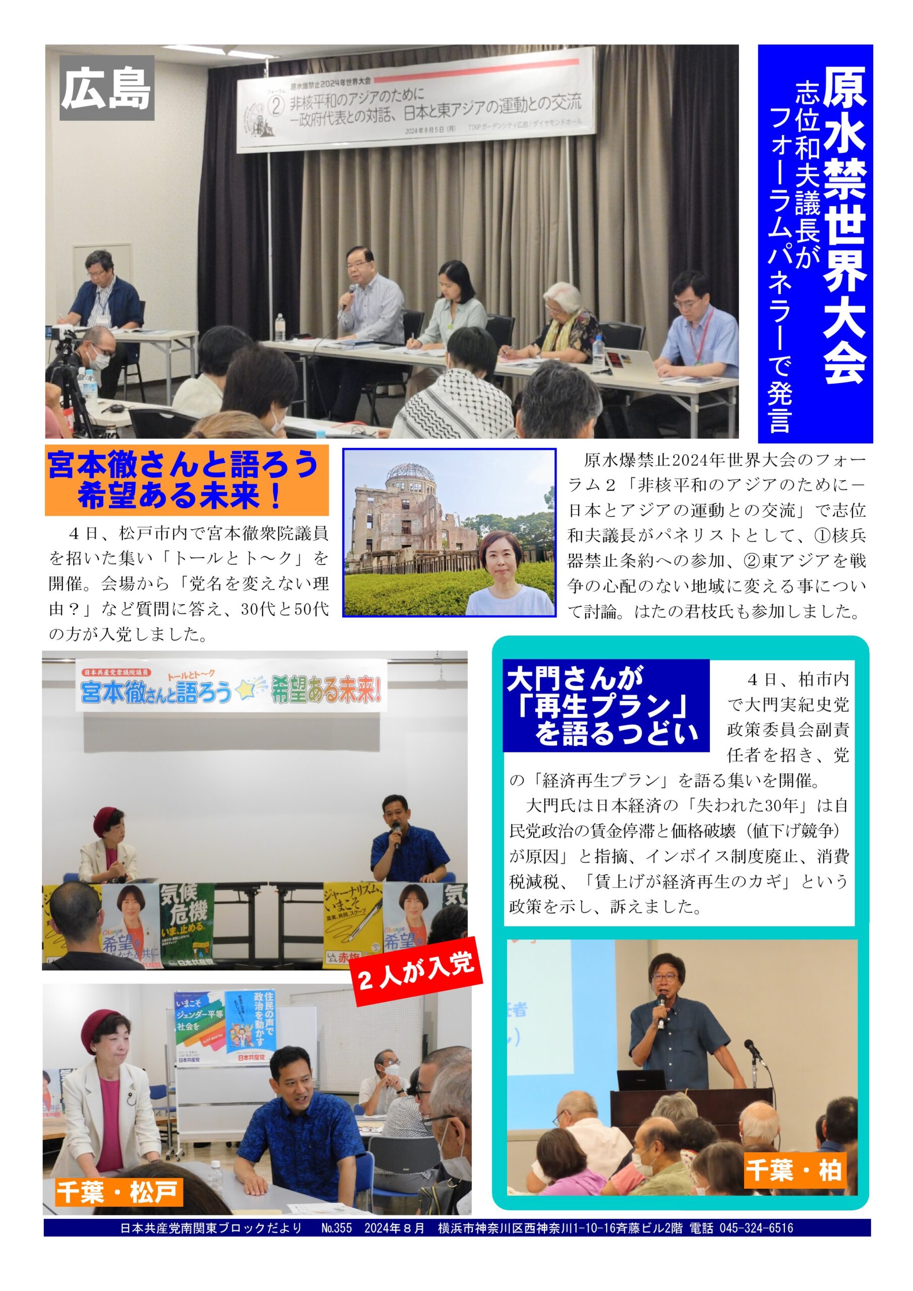 内容は…①志位和夫議長が、原水爆禁止2024年世界大会のフォーラム2のパネリストとして発言。畑野君枝氏も参加。②松戸市内で、宮本徹衆院議員を招いた集い「トールとト~ク」を開催。③柏市内で大門実紀史党政策委員会副責任者を招き、党の「経済再生プラン」を語る集いを開催。
