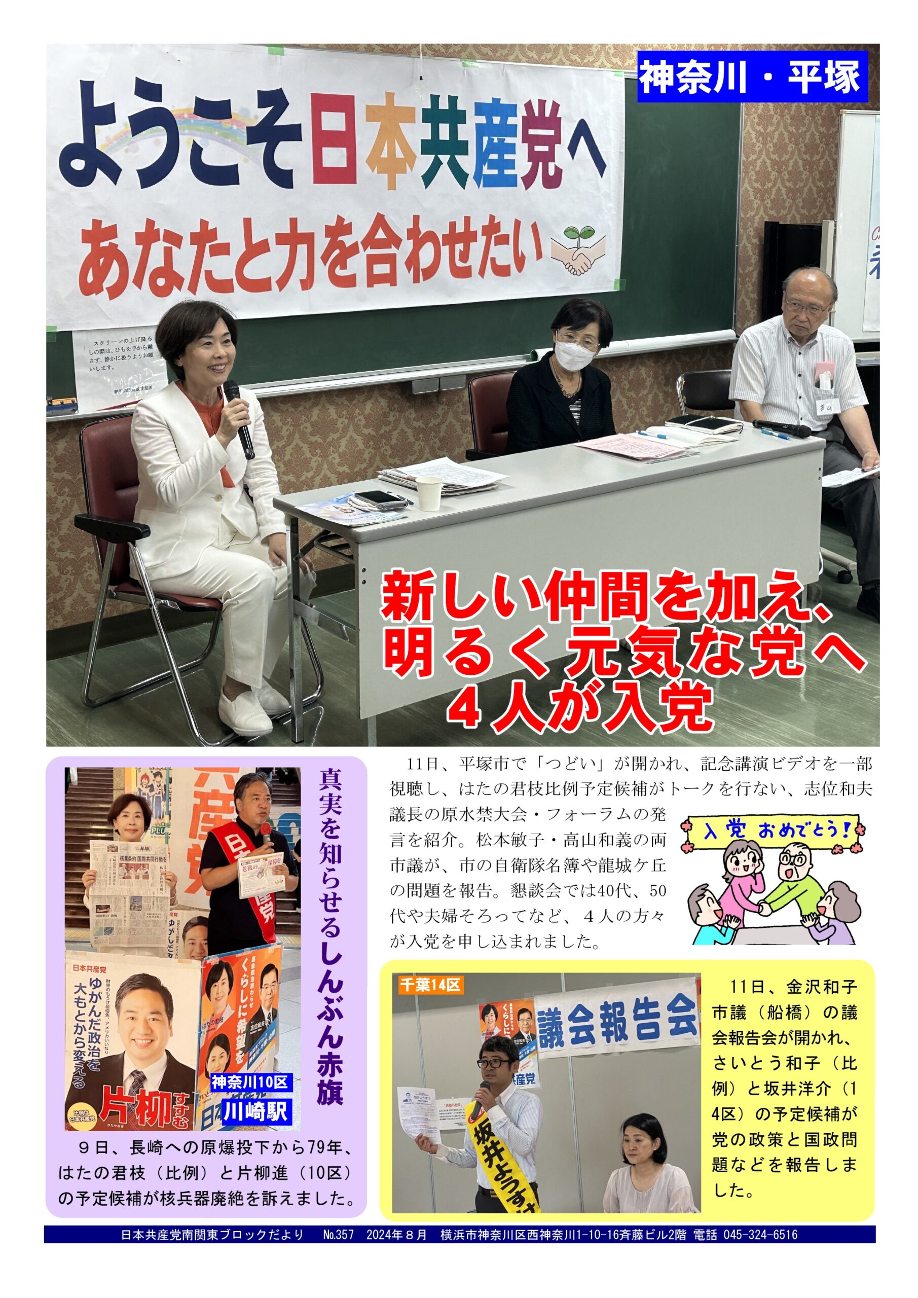 内容は…①11日、平塚市で「つどい」が開かれ、はたの君枝比例予定候補、松本敏子・高山和義両市議が、国政や市政問題をトーク、懇談会では4人が入党。②11日、船橋市で、金沢和子市議の「議会報告会」が開かれ、斉藤和子(比例)・坂井洋介(14区)の予定候補が参加、国政問題を報告。③9日、川崎駅で、畑野君枝(比例)と片柳進(10区)の予定候補が、核兵器廃絶を訴えました。