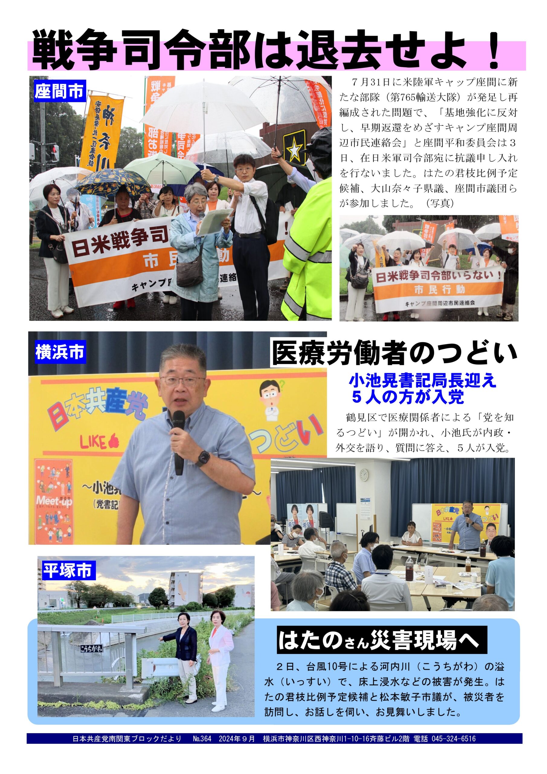 内容は…①米陸軍キャップ座間に新たな部隊が発足し、再編成された問題で、党と民主団体が抗議申し入れを行いました。②小池晃書記局長を迎え、医療関係者の集いで5人が入党。③はたの君枝比例予定候補が台風災害現場を視察。