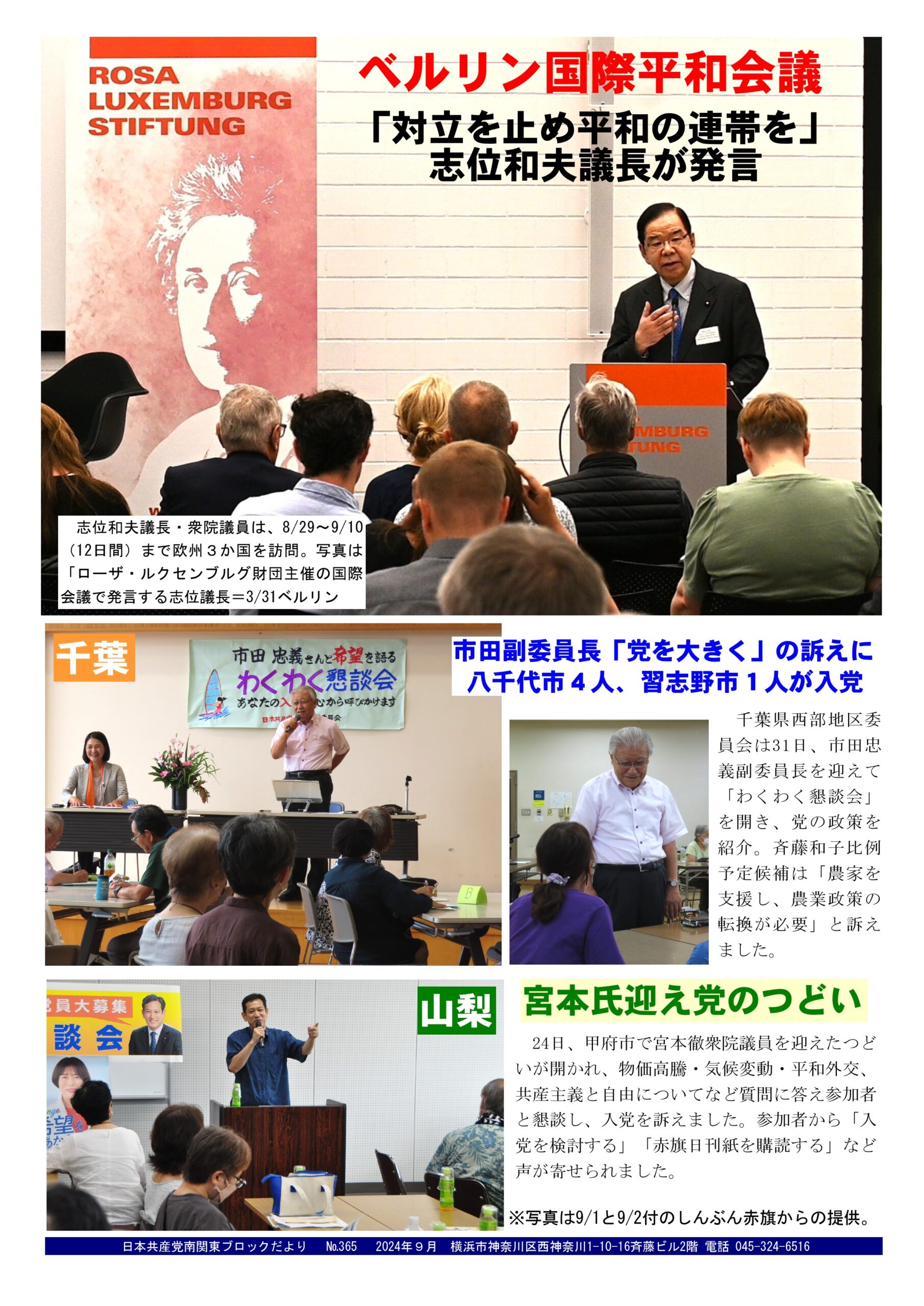 内容は…①志位和夫議長(衆院議員)が、欧州3か国を訪問。ベルリンで国際平和会議で発言。②8月31日、市田忠義副委員長を迎え、八千代市と習志野市で「わくわく懇談会」が開かれ、5人が入党。③8月24日、宮本徹衆院議員を迎え、甲府市で「党を知る会」が開かれました。
