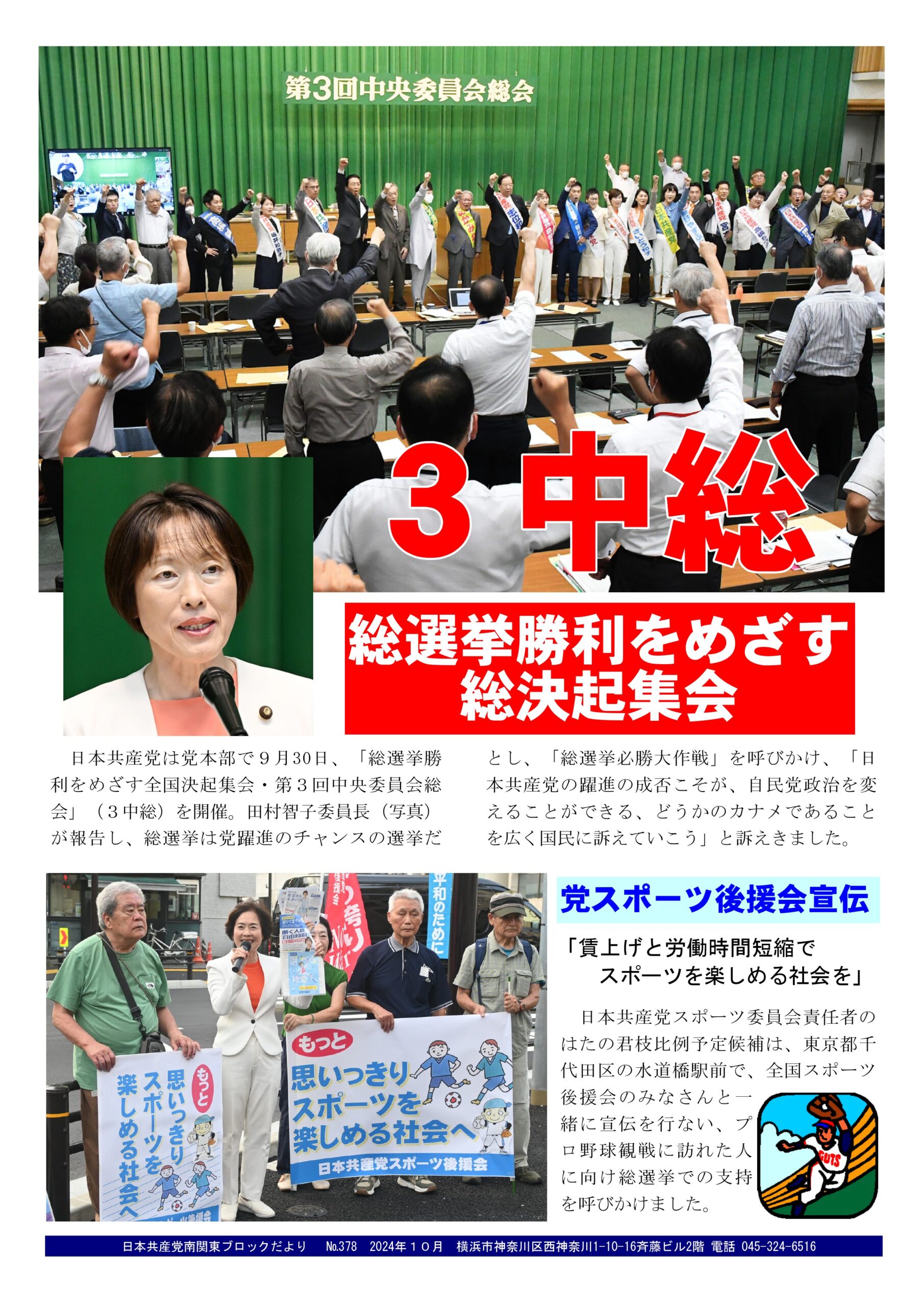 4Oct2024南関東ブロックだより 378号2024年10月4日南関東ブロック事務所だより日本共産党南関東ブロックだより №378を発行。 内容は…①総選挙勝利をめざす総決起集会・第3回日本共産党中央委員会総会開かれました。②日本共産党全国スポーツ後援会の宣伝、水道橋駅前でプロ野球観戦に訪れた人に向けて支援を訴えました。