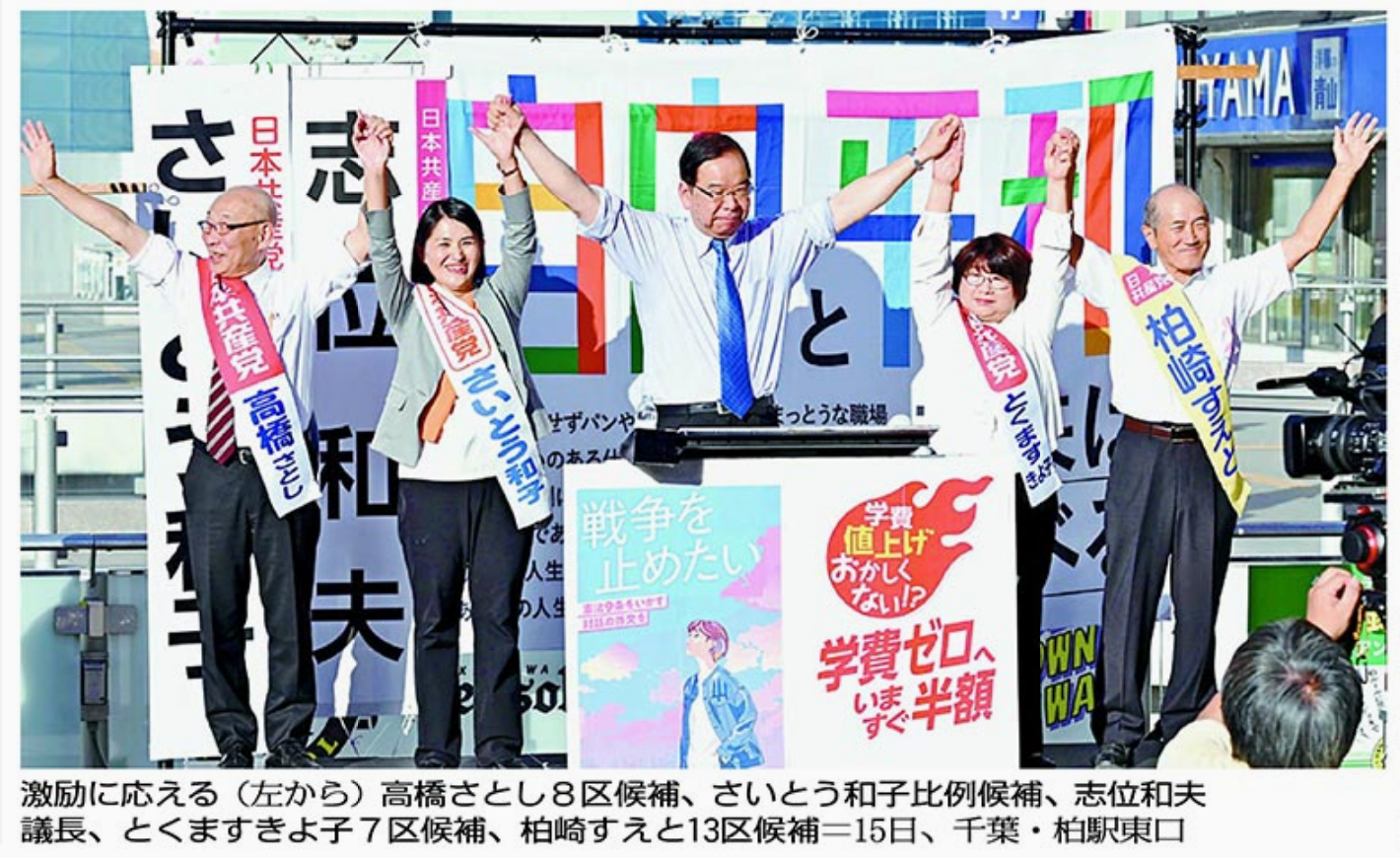 志位氏は比例南関東ブロックの、はたの君枝、さいとう和子、横山せいご(神奈川3区重複)各候補らとともに「南関東ブロックで2議席絶対獲得、3議席を必ず奪還しましょう。南関東から日本の政治を変える素晴らしい勝利を」と呼び掛けました。