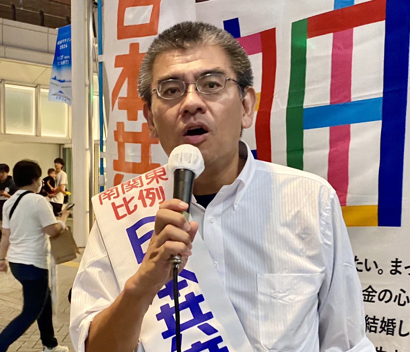 新横浜駅で演説中、親子連れの方がビラまきを手伝っていただきましたが、そのつぎの横浜駅西口でも演説をお聞きいただきました。