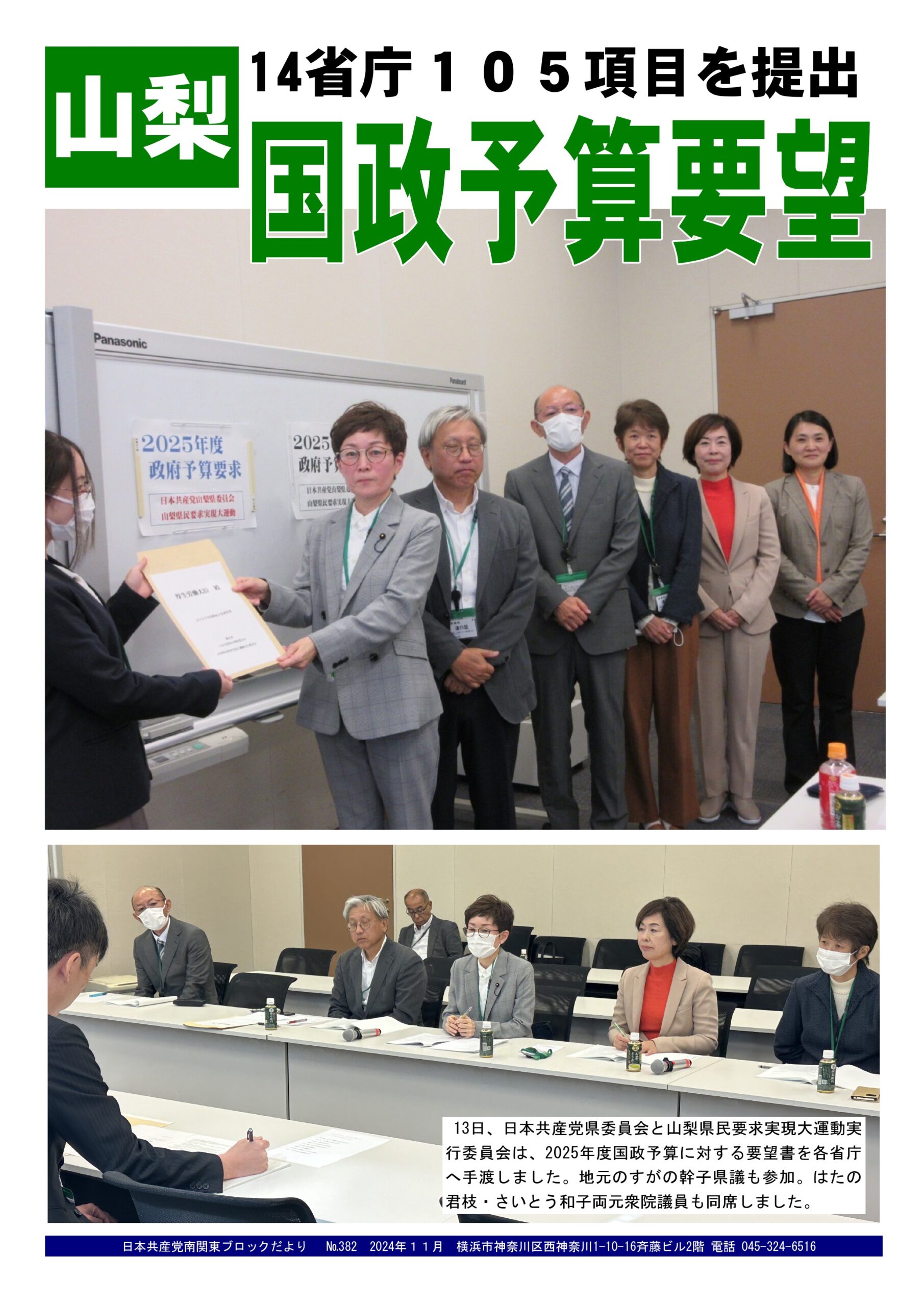 14Nov2024南関東ブロックだより 382号2024年11月14日南関東ブロック事務所だより日本共産党南関東ブロックだより №382を発行。 内容は…①日本共産党山梨県委員会と山梨県民要求実現大運動実行委員会が、2025年度国政予算要望を提出。畑野君枝・斉藤和子両元衆院議員が参加しました。