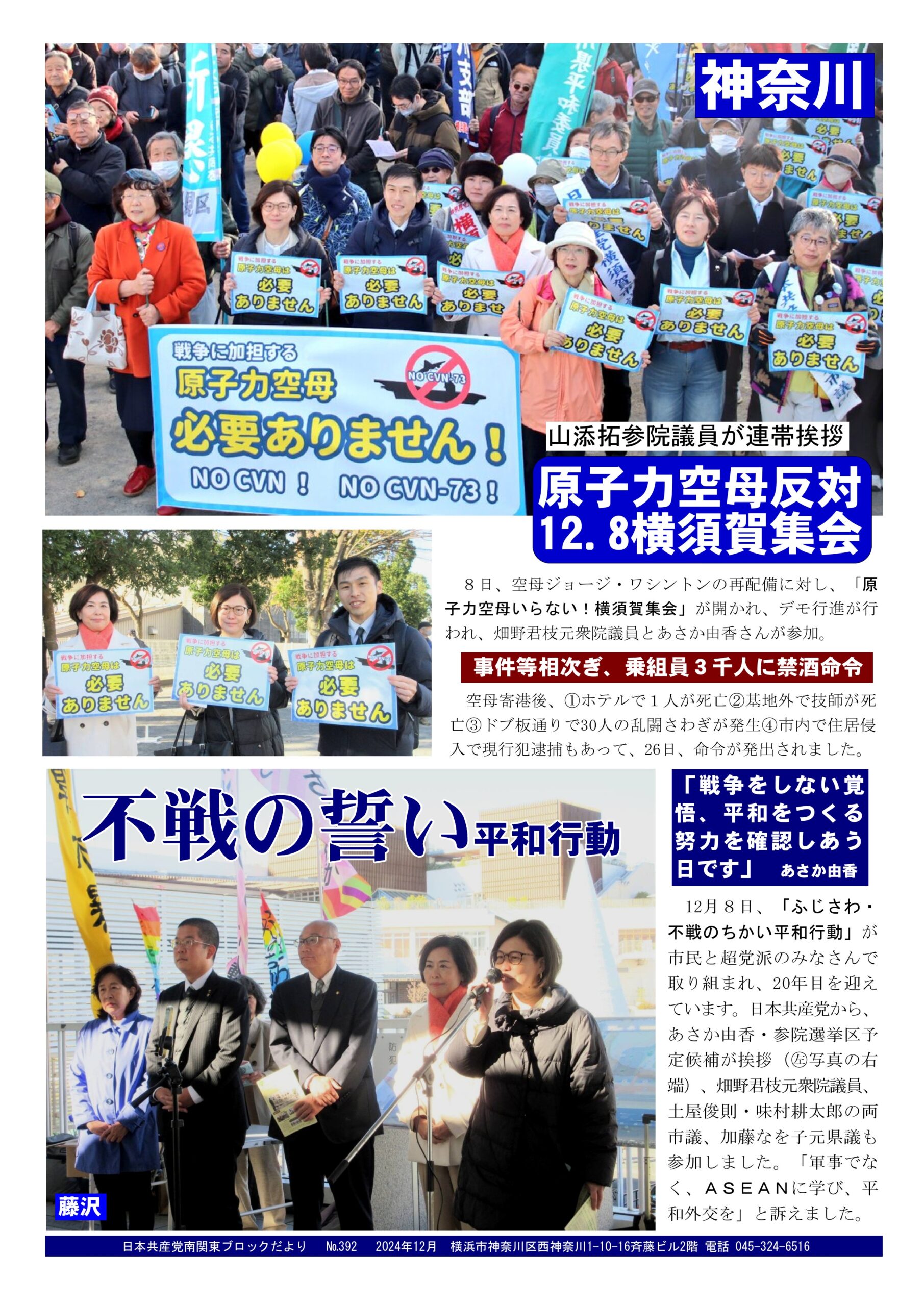 内容は…①12月8日、「原子力空母いらない!横須賀集会」が開かれ、山添拓参院議員が連帯の挨拶。畑野君枝元衆院議員、あさか由香参院選挙区予定候補、地方議員らが参加しました。②8日、「ふじさわ・不戦のちかい」平和行動が市民や超党派のみなさんで行われ、日本共産党は、あさか由香参院選挙区予定候補が挨拶、はたの君枝元衆院議員、地元市議らも参加しました。