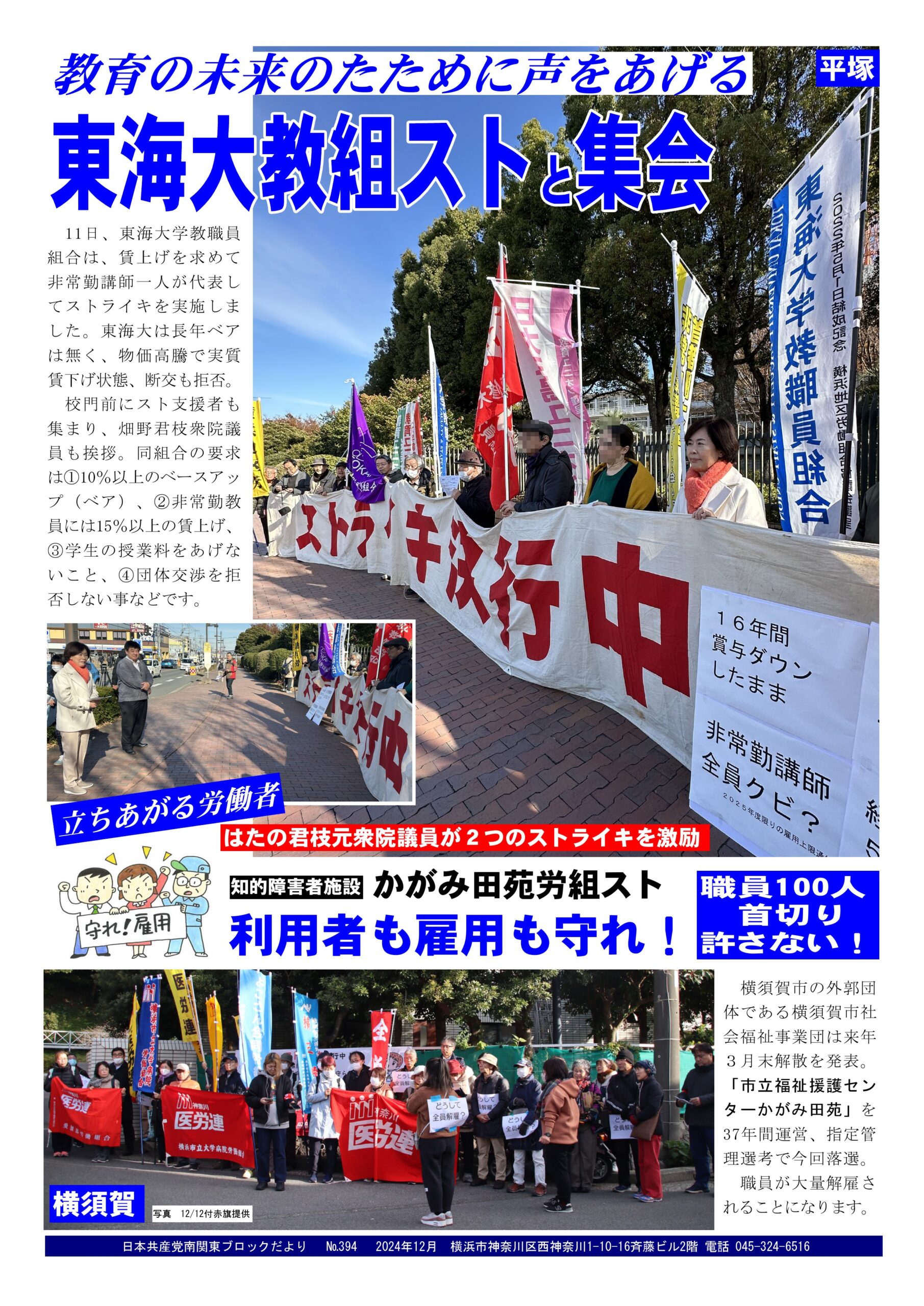 内容は…①東海大学教組がストライキと集会、10%以上のベースアップなどを要求。②かがみ田苑労組がストライキ。知的障碍者施設の「市立福祉援護センター」職員100人の解雇に対し、利用者と雇用を守るように求めています。