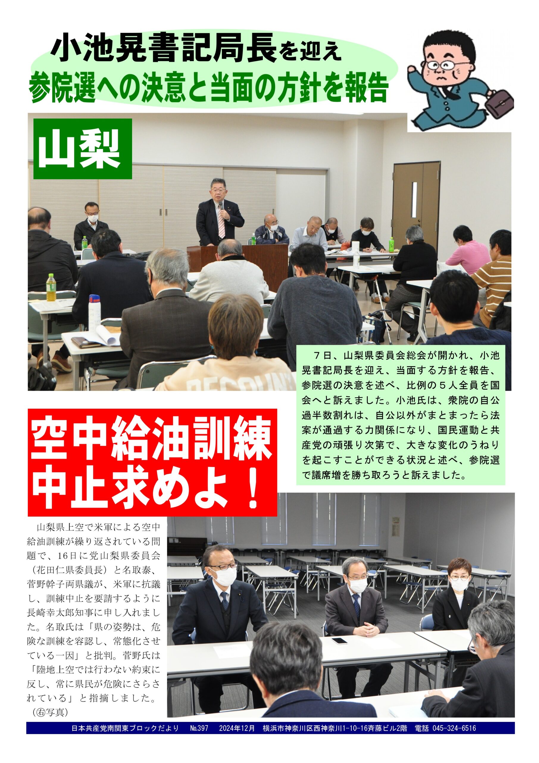 内容は…①日本共産党山梨県委員会総会が開かれ、小池晃書記局長が参院選の決意と当面の方針を報告しました。②米軍の空中給油訓練問題で、山梨県委員会と県議団(名取泰、菅野幹子)が、県知事に対し、米軍に抗議し、訓練中止を要請するように求める申し入れを行いました。