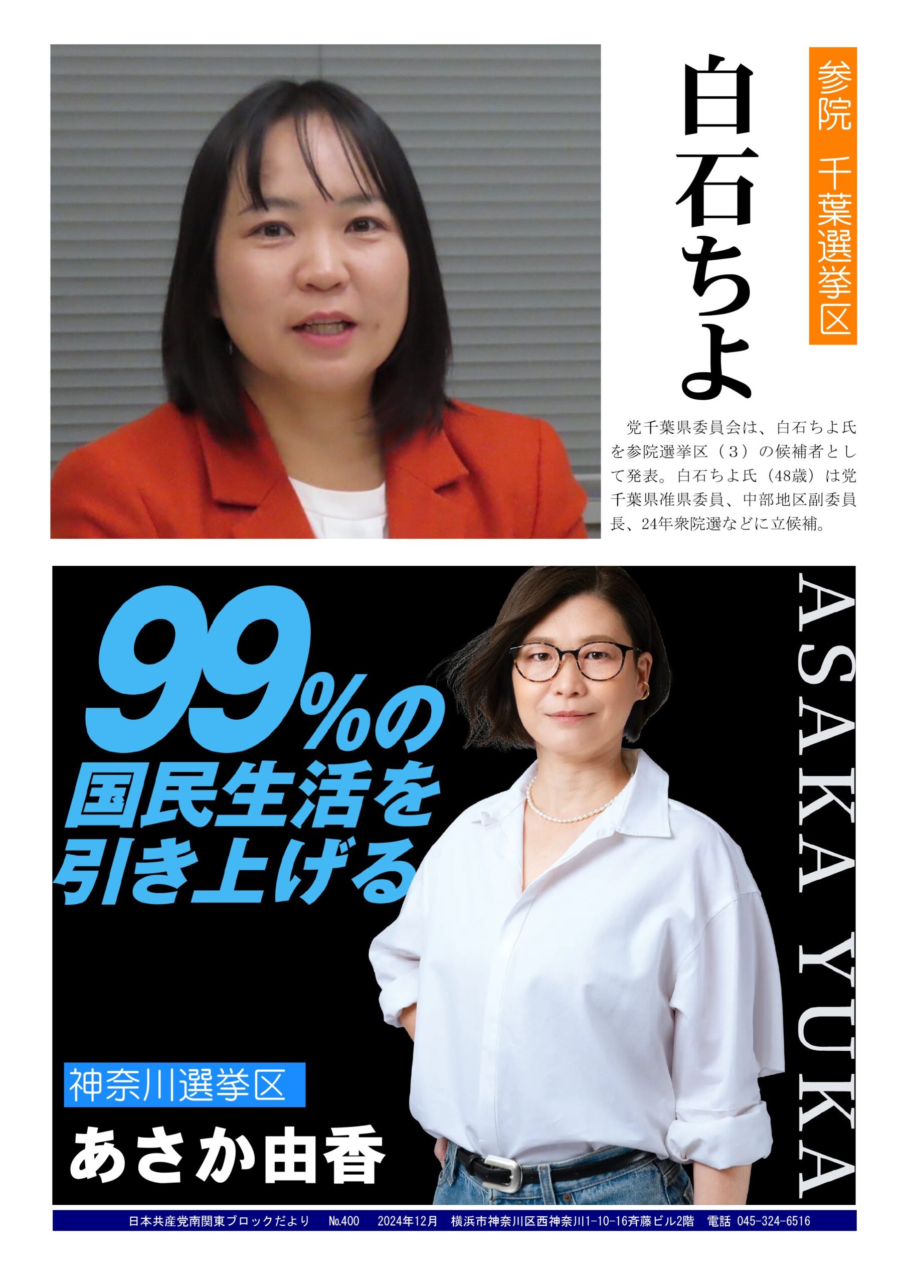 27Dec2024南関東ブロックだより 400号2024年12月27日南関東ブロック事務所だより日本共産党南関東ブロックだより №400を発行。 内容は…①2025年参院選の千葉選挙区(定数3)に、白石ちよ氏を擁立すると発表。25日に記者会見しました。②神奈川選挙区(定数4) あさか由香予定候補。