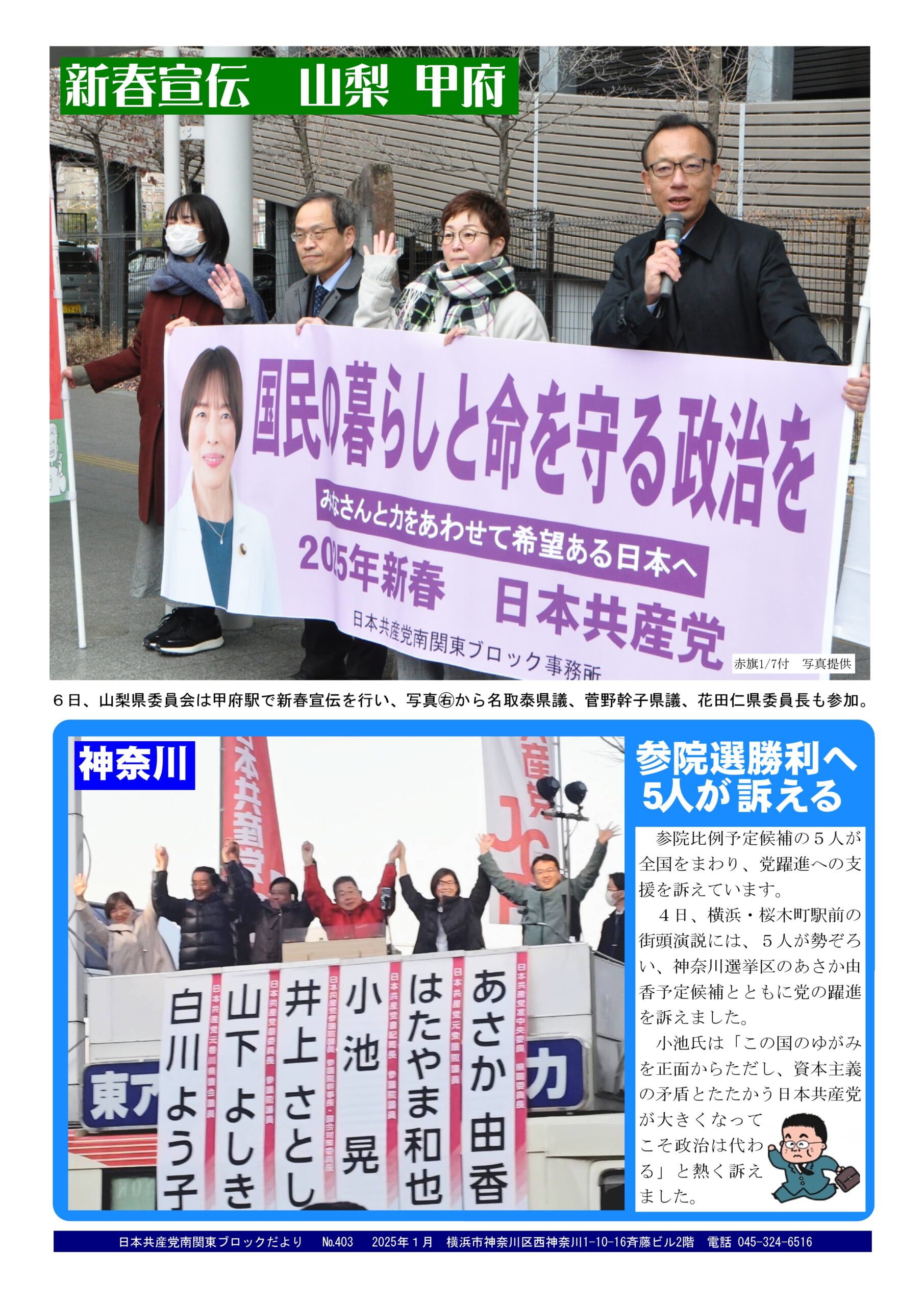 内容は…①山梨県委員会と県議団は、甲府駅前で新春宣伝、新年の挨拶と参院選の党躍進への支援を訴えました。②4日、桜木町駅前で、参院比例予定候補の5人(小池晃、井上さとし、山下よしき、はたやま和也、白川よう子)と参院神奈川選挙区のあさか由香予定候補が新年の挨拶と党躍進への支援を訴えました。