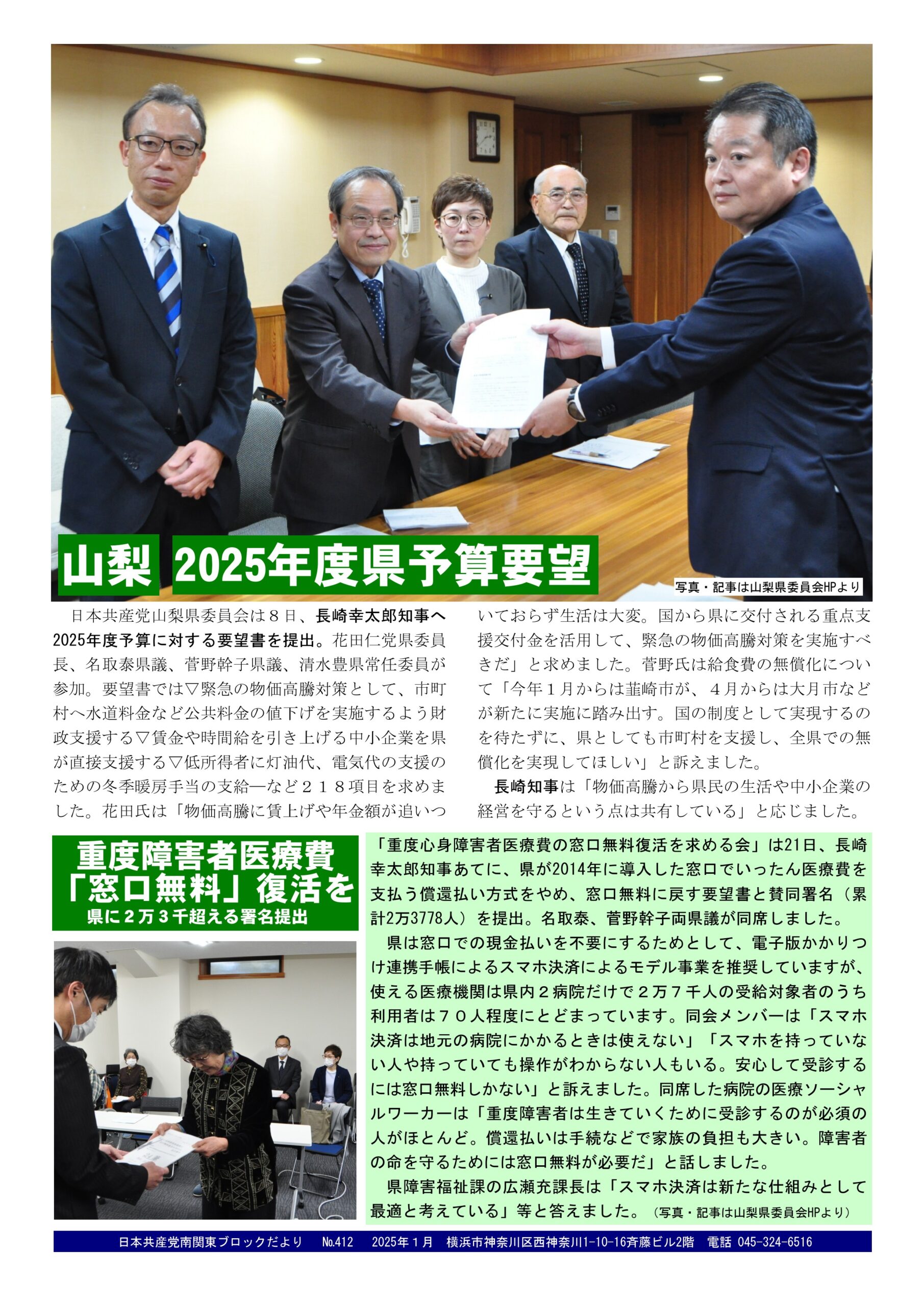 内容は…①日本共産党山梨県委員会は、1月8日に2025年度県予算に対する要望書を提出。花田仁委員長から長崎幸太郎知事に手渡しました。②21日、「重度心身障害者医療費の窓口無料復活を求める会」は、長崎幸太郎知事宛に、償還払いをやめて、窓口無料化に戻す要望書と署名を提出しました。名取泰・菅野幹子両県議も同席しました。