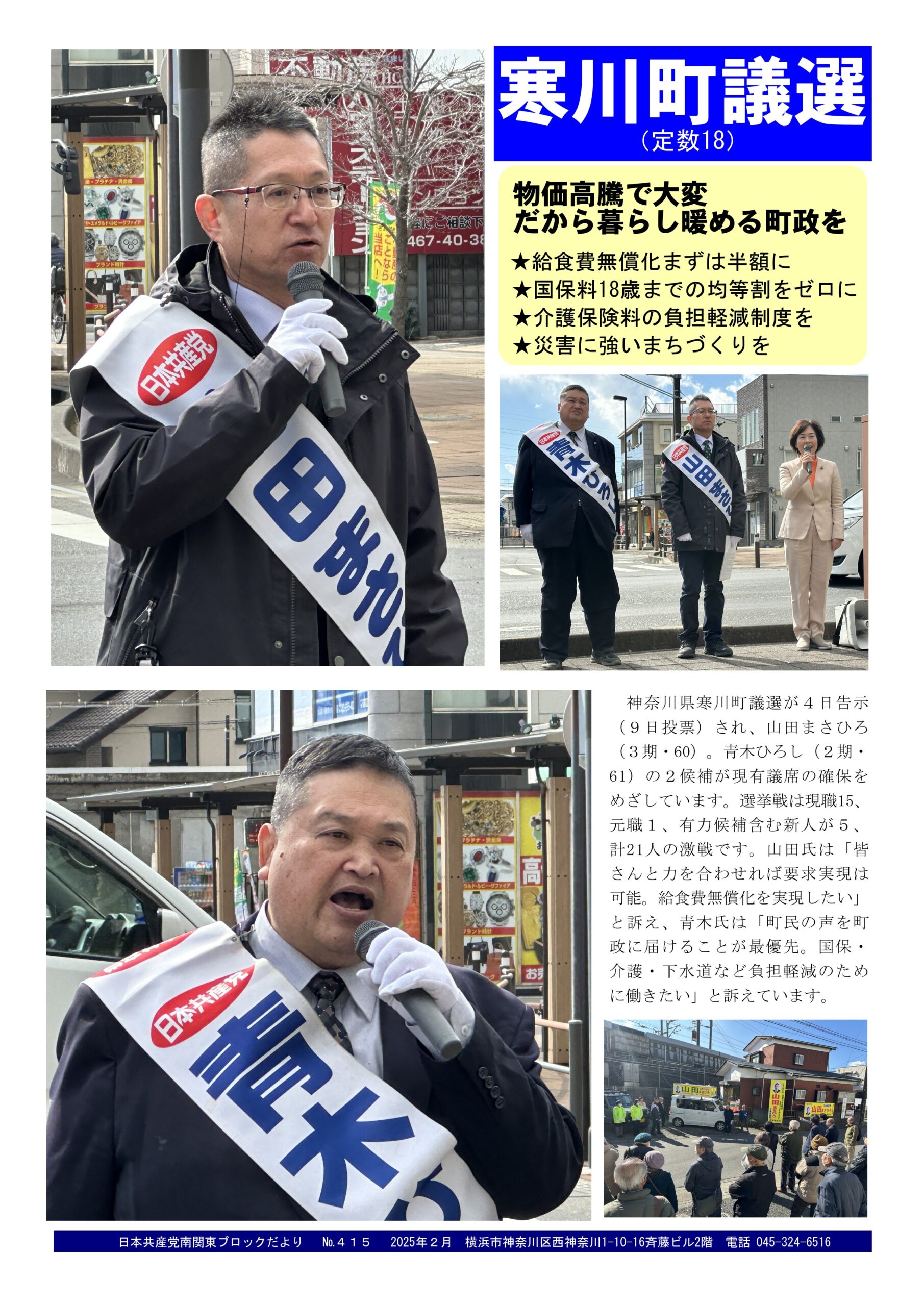 内容は…①神奈川県・寒川町議選が4日告示(投票9日)され、日本共産党は山田まさひろ候補と青木ひろし候補の現有2議席をめざしています。出発式には畑野君枝元衆院議員も駆けつけ、「町民の暮らしと福祉を守る2候補を議会へ送り出してほしい」と訴えました。