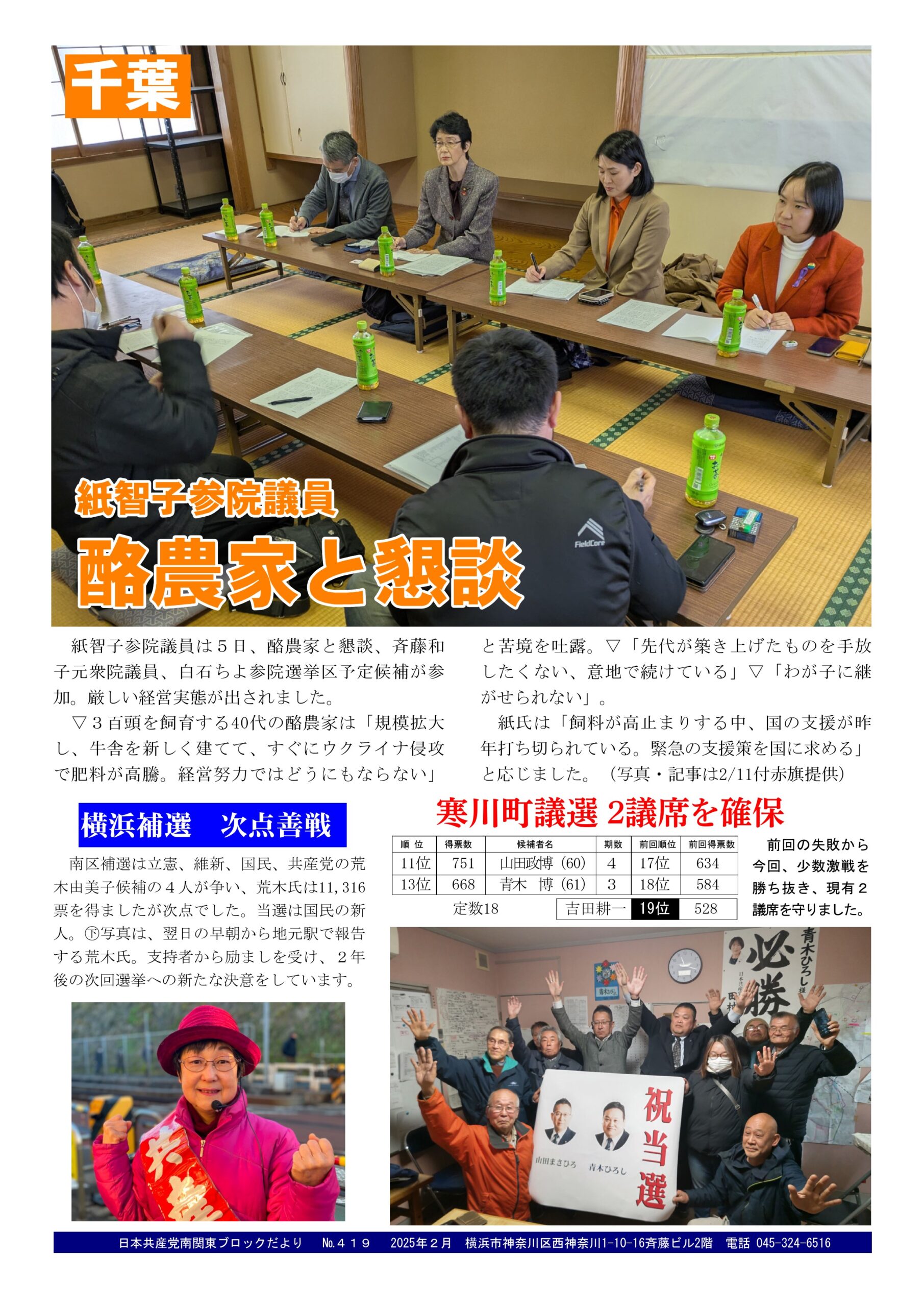 内容は…①紙智子参院議員が酪農家と懇談。斉藤和子元衆院議員、白石ちよ参院選挙区予定候補が参加しました。②神奈川・寒川町議選(定数18)で、現職の山田政博、青木ひろしの両候補が当選。現有2議席を確保。③横浜市議補選(南区)の荒木由美子候補は善戦しましたが、次点となりました。