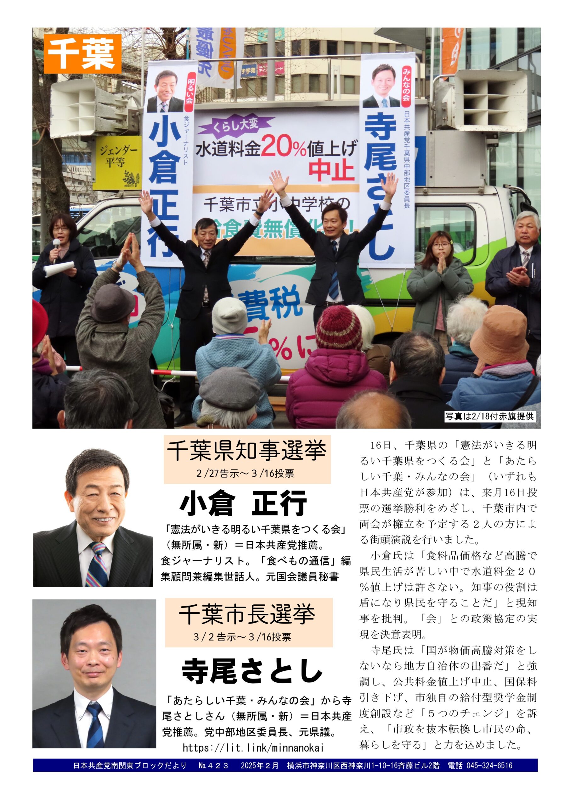 内容は…①千葉県知事選挙(2/27告示~3/16投票)と千葉市長選挙(3/2告示~3/16投票)が行われます。「憲法がいきる明るい千葉県をつくる会」は、小倉正幸氏を擁立。「あたらしい千葉・みんなの会」は、寺尾さとし氏を擁立します。16日、2団体は千葉市内で小倉氏と寺尾氏の合同街頭演説を行ないました。