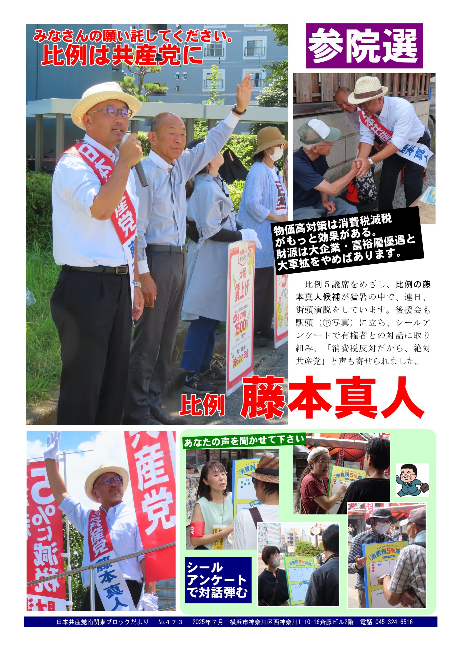15Jul2025南関東ブロックだより 473号2025年7月15日南関東ブロック事務所だより日本共産党南関東ブロックだより №473を発行。 内容は…①比例の藤本真人候補の活動を紹介しています。②千葉県内の街頭でシール投票によるアンケートが実施され、様々な要求も寄せられ、対話が行われています。