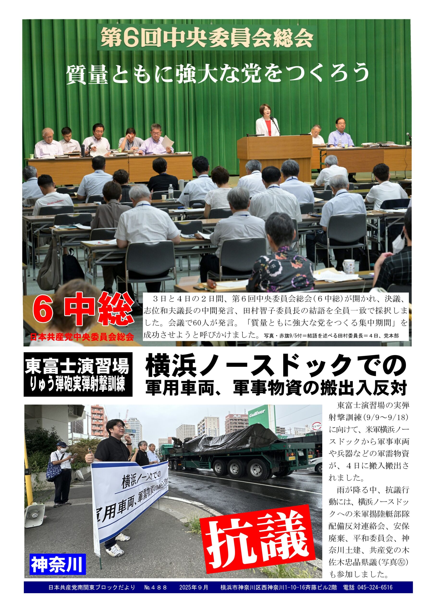 8Sep2025日本共産党南関東ブロックだより 488号2025年9月8日南関東ブロック事務所だより日本共産党南関東ブロックだより №488を発行。 内容は…①第6回日本共産党中央委員会総会〈6中総〉が3日と4日の2日間開かれ、決議、中間発言、結語が全員一致で採択されました。②東富士演習場のりゅう弾砲実弾射撃訓練が予定され、横浜ノースドックからは軍用車両や軍需物資の排出入されます。4日、市民団体の抗議行動が行われました。