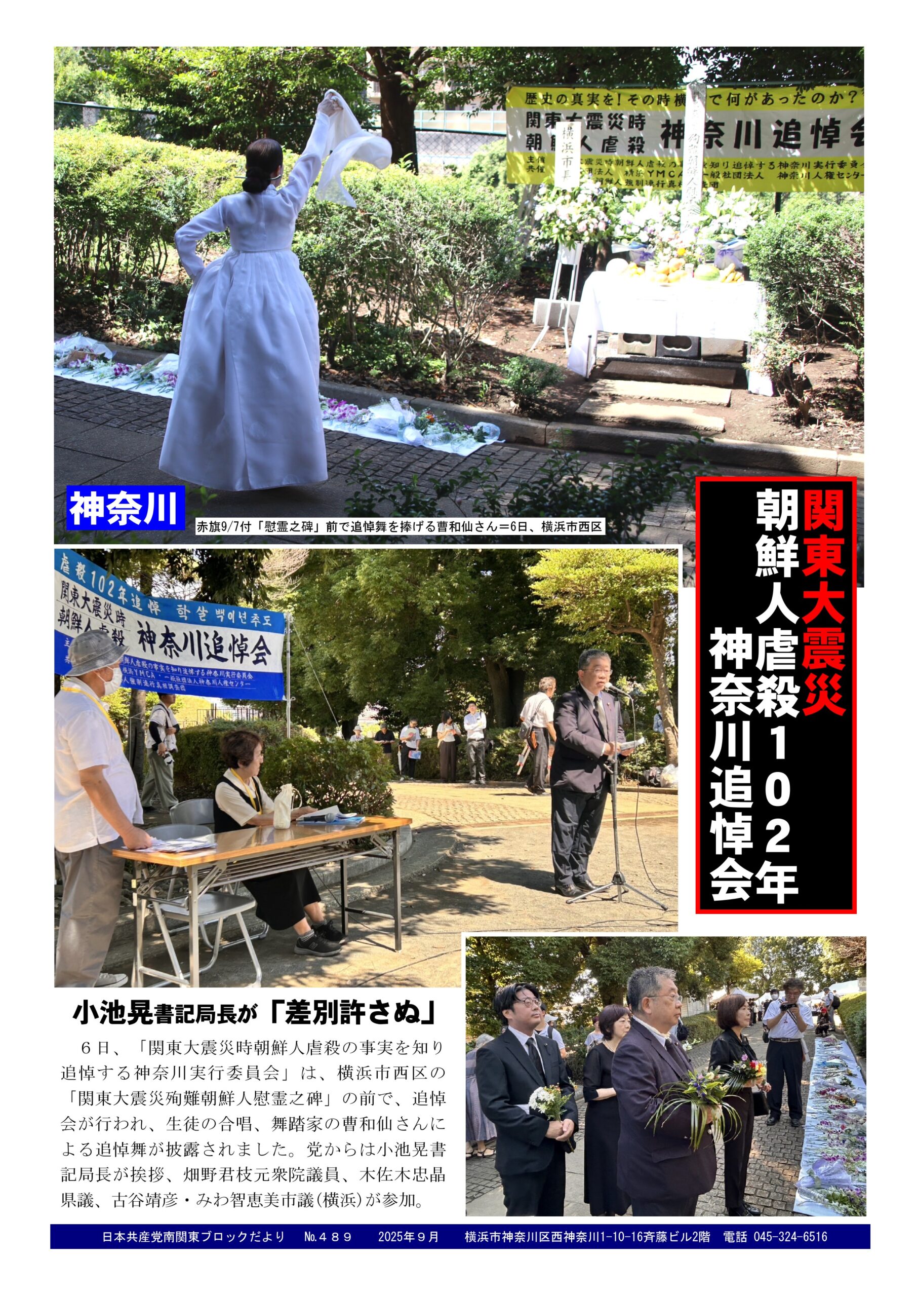 8Sep2025日本共産党南関東ブロックだより 489号2025年9月8日南関東ブロック事務所だより日本共産党南関東ブロックだより №489を発行。 内容は…6日、「関東大震災時朝鮮人虐殺の事実を知り追悼する神奈川実行委員会」主催で、「関東大震災殉難朝鮮人慰霊之碑」の前で追悼会が行われ、日本共産党の小池晃書記局長が挨拶、畑野君枝元衆院議員、地方議員らも参加しました。