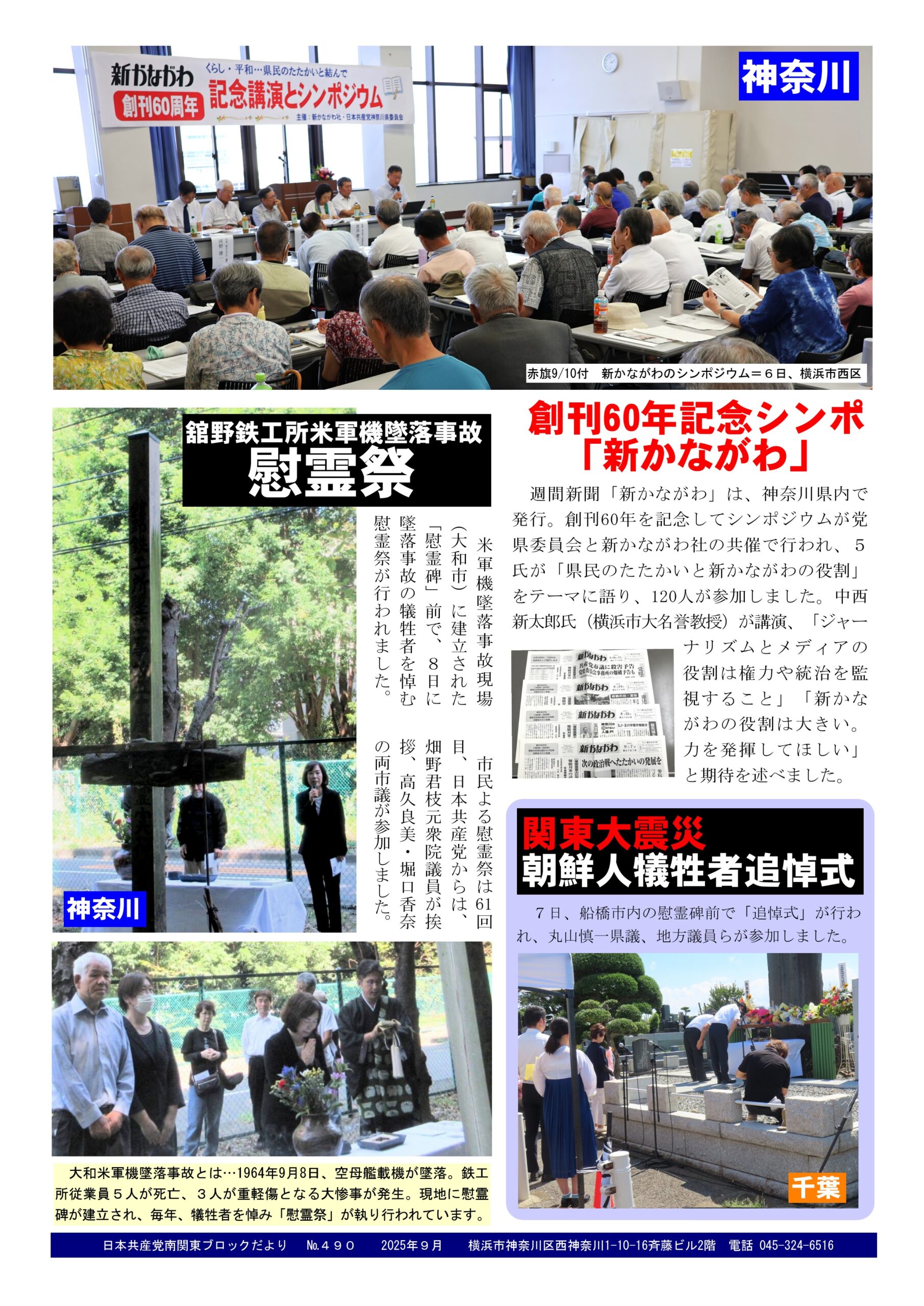 10Sep2025日本共産党南関東ブロックだより 490号2025年9月10日南関東ブロック事務所だより日本共産党南関東ブロックだより №490を発行。 内容は…①週間新聞「新かながわ」の創刊60年、記念講演とシンポジウムが行われました。②1964年米軍機墜落事故の慰霊祭が行われ、畑野君枝元衆院議員が挨拶、地方議員らが参加。③千葉県船橋市で、関東大震災の朝鮮人犠牲者追悼会が行われ、丸山慎一県議、党議員らが参加しました。