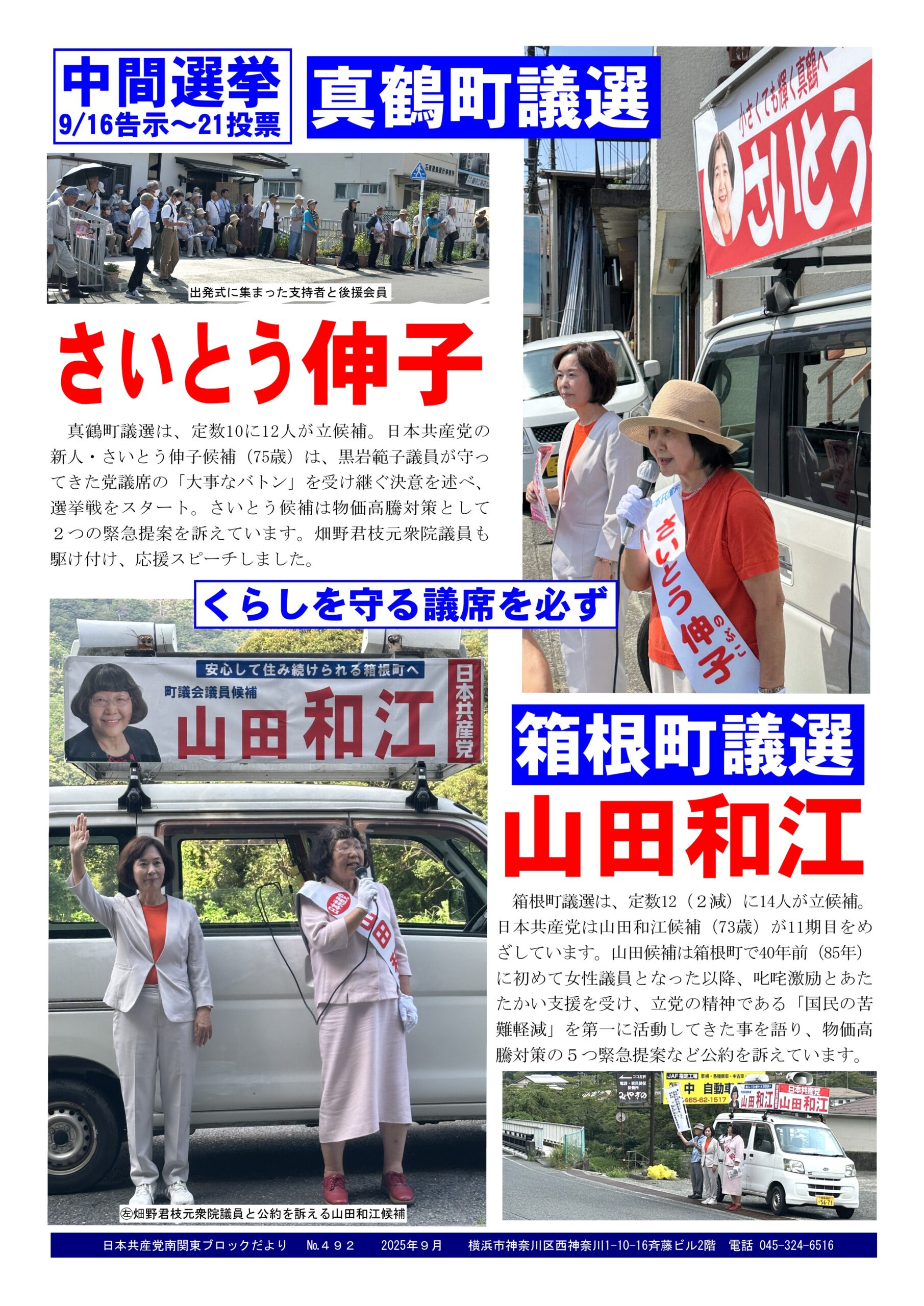 19Sep2025日本共産党南関東ブロックだより 492号2025年9月19日南関東ブロック事務所だより日本共産党南関東ブロックだより №492を発行。 内容は…①真鶴町議選が16日告示、さいとう伸子候補の出発式が行われ、多くの支援者が集まり、畑野君枝元衆院議員が駆け付けました。②箱根町議選も16日スタート、11期目をめざす山田和江候補は、畑野君枝元衆院議員と街頭演説に立ち、公約を訴えました。