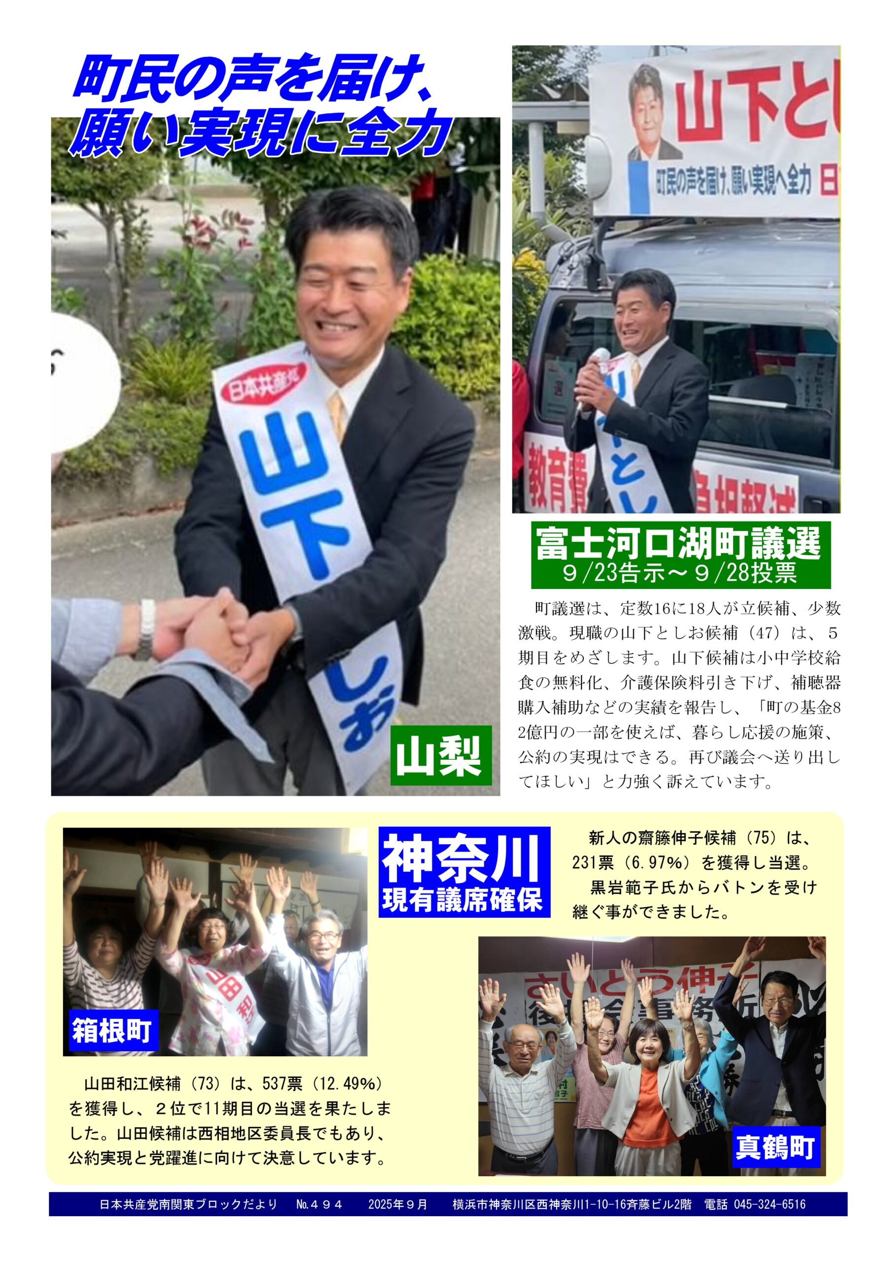 25Sep2025日本共産党南関東ブロックだより 494号2025年9月25日南関東ブロック事務所だより日本共産党南関東ブロックだより №494を発行。 内容は…①山梨県・富士河口湖町議選が23日告示、5期目をめざす山下としお候補が第一声。②21日投開票の中間選挙結果 真鶴町議選は、新人のさいとう伸子候補が当選。箱根町議選は現職の山田和江候補が11期目の当選を果たしました。