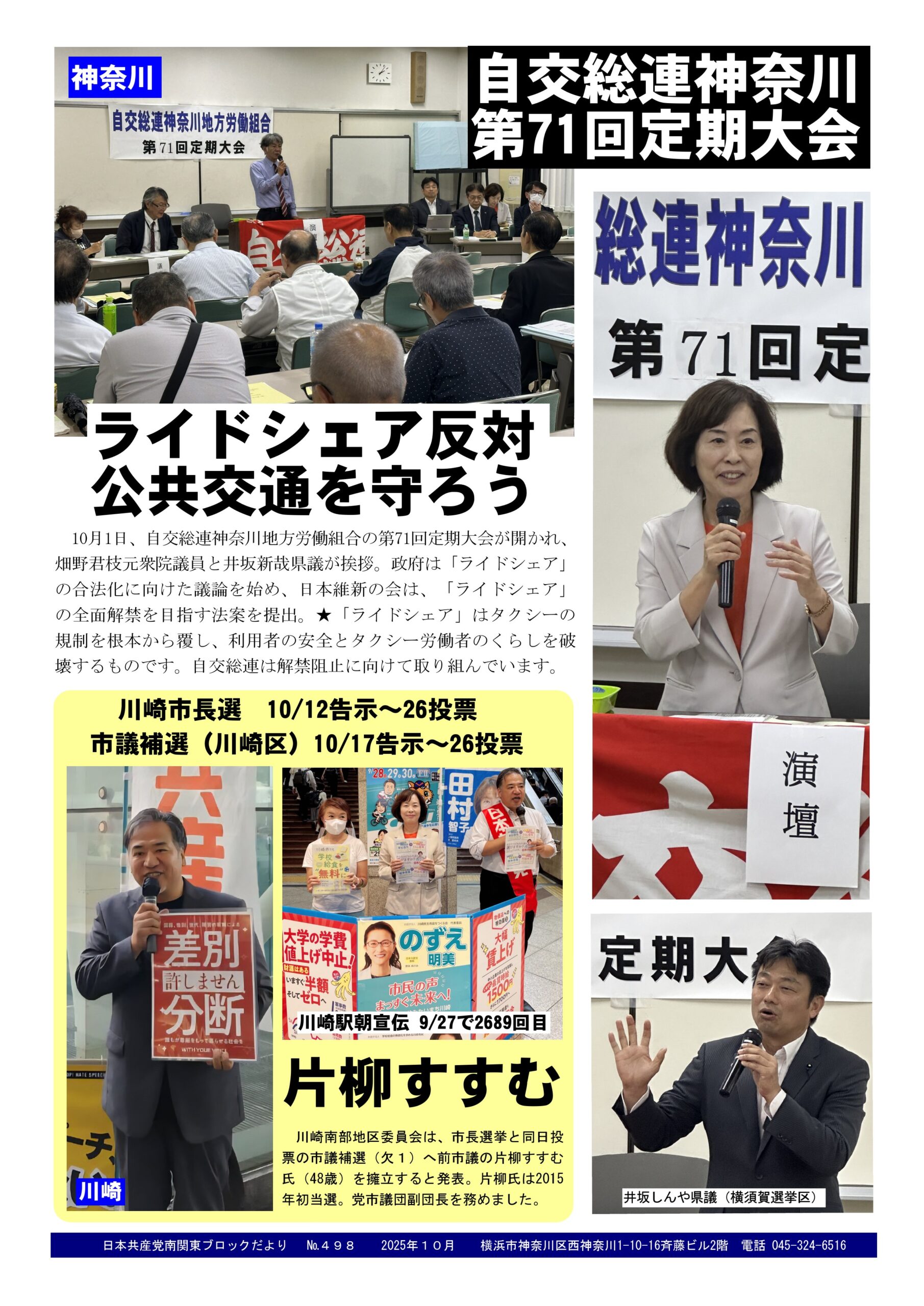 2Oct2025日本共産党南関東ブロックだより 498号2025年10月2日南関東ブロック事務所だより日本共産党南関東ブロックだより №498を発行。 内容は…①自交総連神奈川労組の第71回定期大会が開かれ、畑野君枝元衆院議員と井坂新哉県議が連帯挨拶。②川崎市議補選(欠員1、10月17日告示~26投開票・市長選と当日)に片柳すすむ氏(前市議)を擁立することを発表。現市政とキッパリと対決できる党議席の奪回めざします。