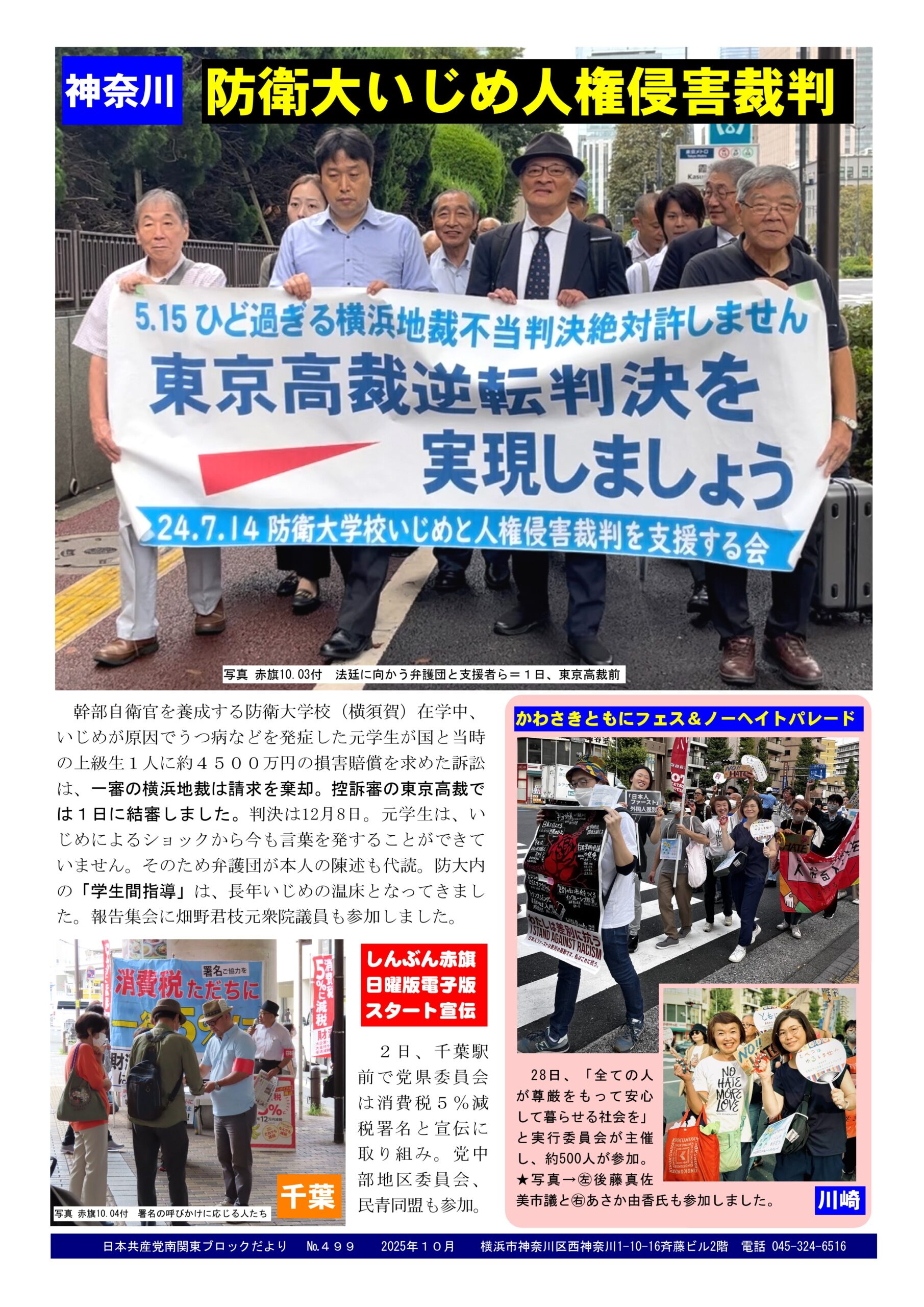 6Oct2025日本共産党南関東ブロックだより 499号2025年10月6日南関東ブロック事務所だより日本共産党南関東ブロックだより №499を発行。 内容は…①防衛大いじめ人権侵害裁判が1日に結審、12月8日判決がでます。②9月28日、川崎区内で「かわさきとももにフェス&ノーヘイトパレード」が行われ、音楽、スピーチ、パレードでアピール。③10月2日、党千葉県委員会が千葉駅前で署名と宣伝。