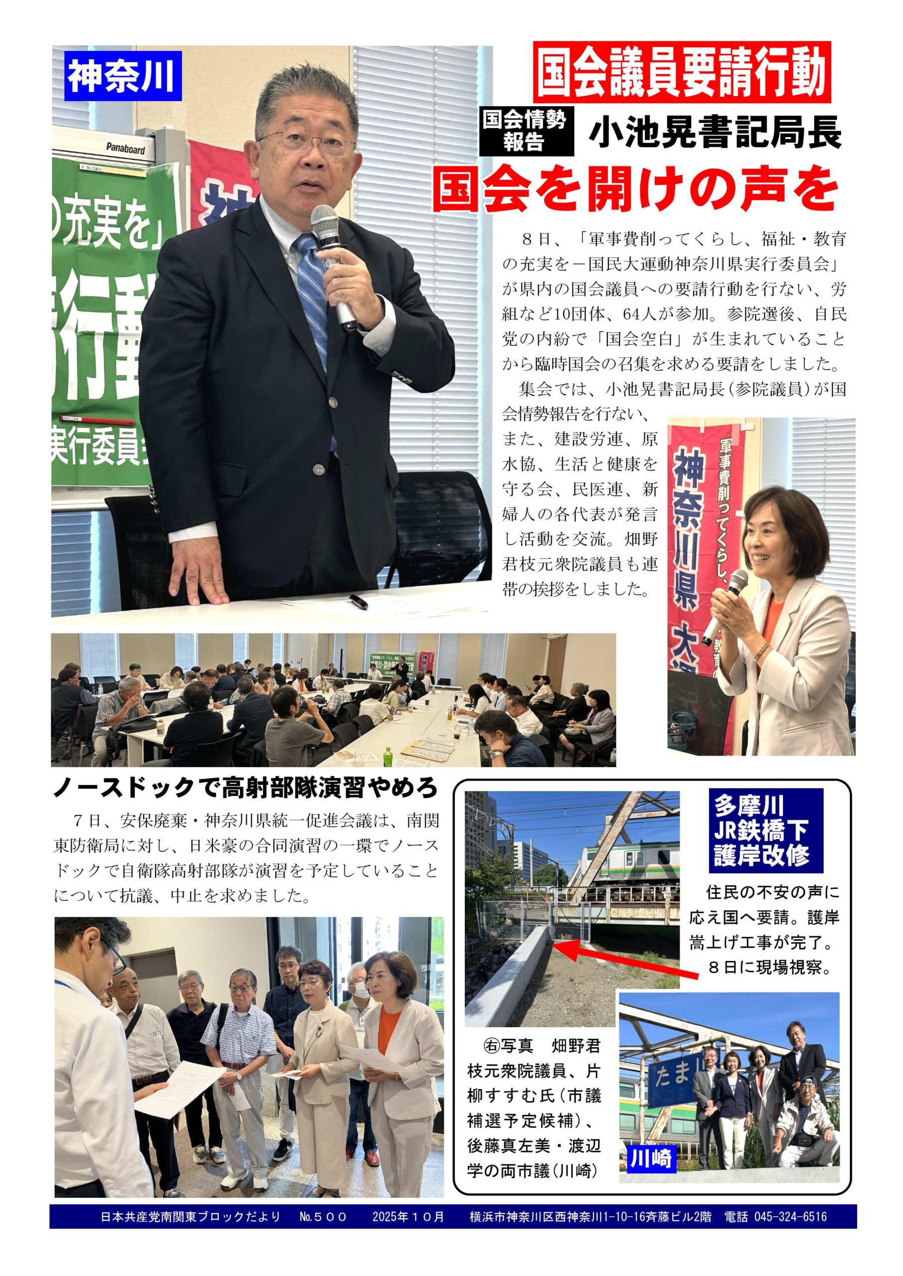 9Oct2025日本共産党南関東ブロックだより 500号2025年10月9日南関東ブロック事務所だより日本共産党南関東ブロックだより №500を発行。 内容は…①8日、神奈川・国民大運動実行委員会が、集会と国会議員要請行動を行ない、10団体64人が参加。小池晃書記局長が「国会情勢報告」、畑野君枝元衆院議員は連帯挨拶をしました、②7日、統一促進会議は、日米豪の合同訓練の一環でノースドッグで高射部隊演習を行なう事から、南関東防衛局に対し、抗議と演習中止を求めました。③7日、多摩川のJR鉄橋下の護岸嵩上げ工事が完了。畑野君枝元衆院議員と後藤・渡辺の両市議らが現地視察。