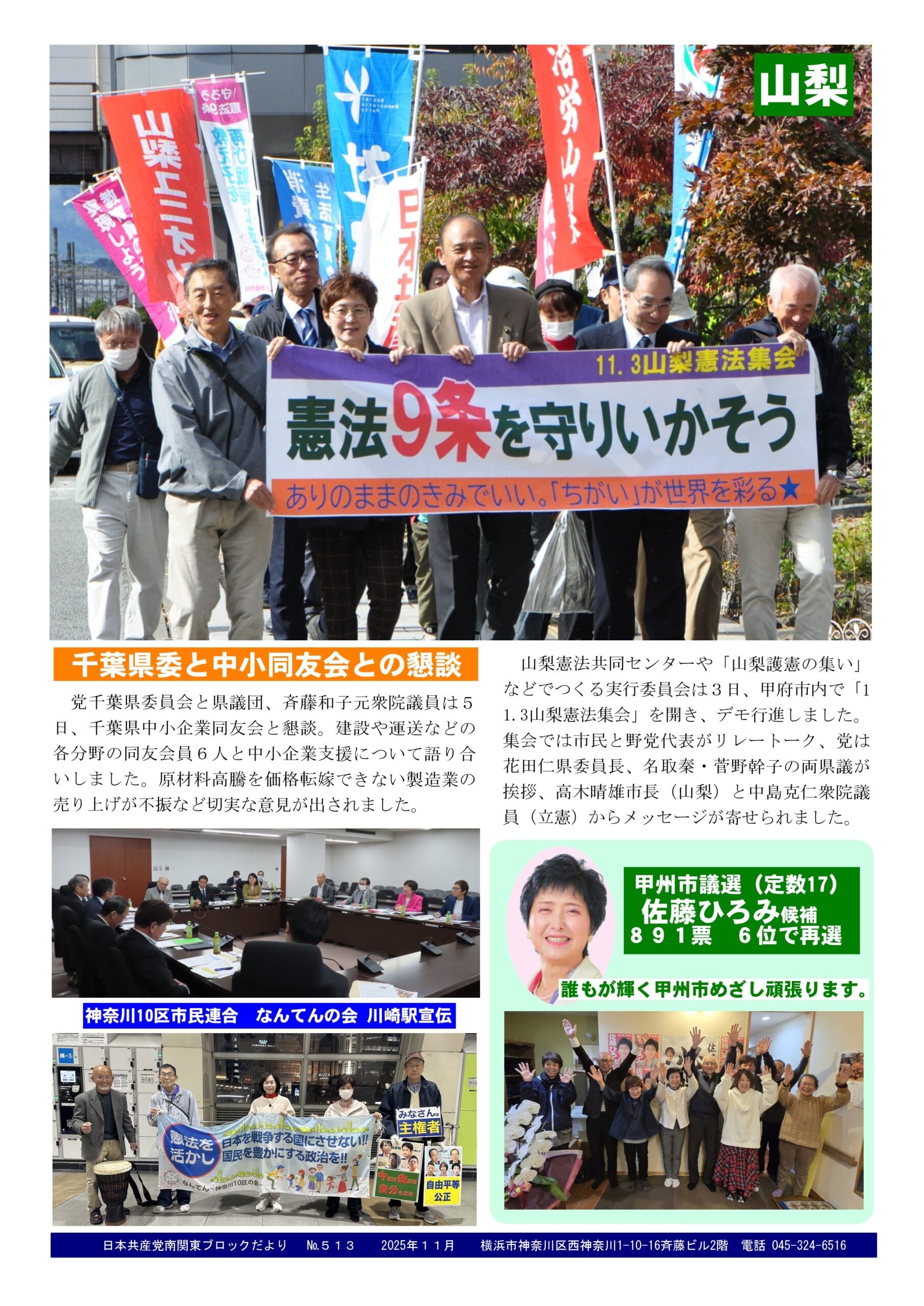 12Nov2025日本共産党南関東ブロックだより 513号2025年11月12日南関東ブロック事務所だより日本共産党南関東ブロックだより №513を発行。 内容は…①11.3山梨憲法集会開かれる。②甲州市議選結果、佐藤浩美候補が当選。③党千葉県委員会と中小企業同友会が懇談、斉藤和子元衆院議員が同席。④神奈川10区市民連合のなんてんの会が毎月の宣伝行動。