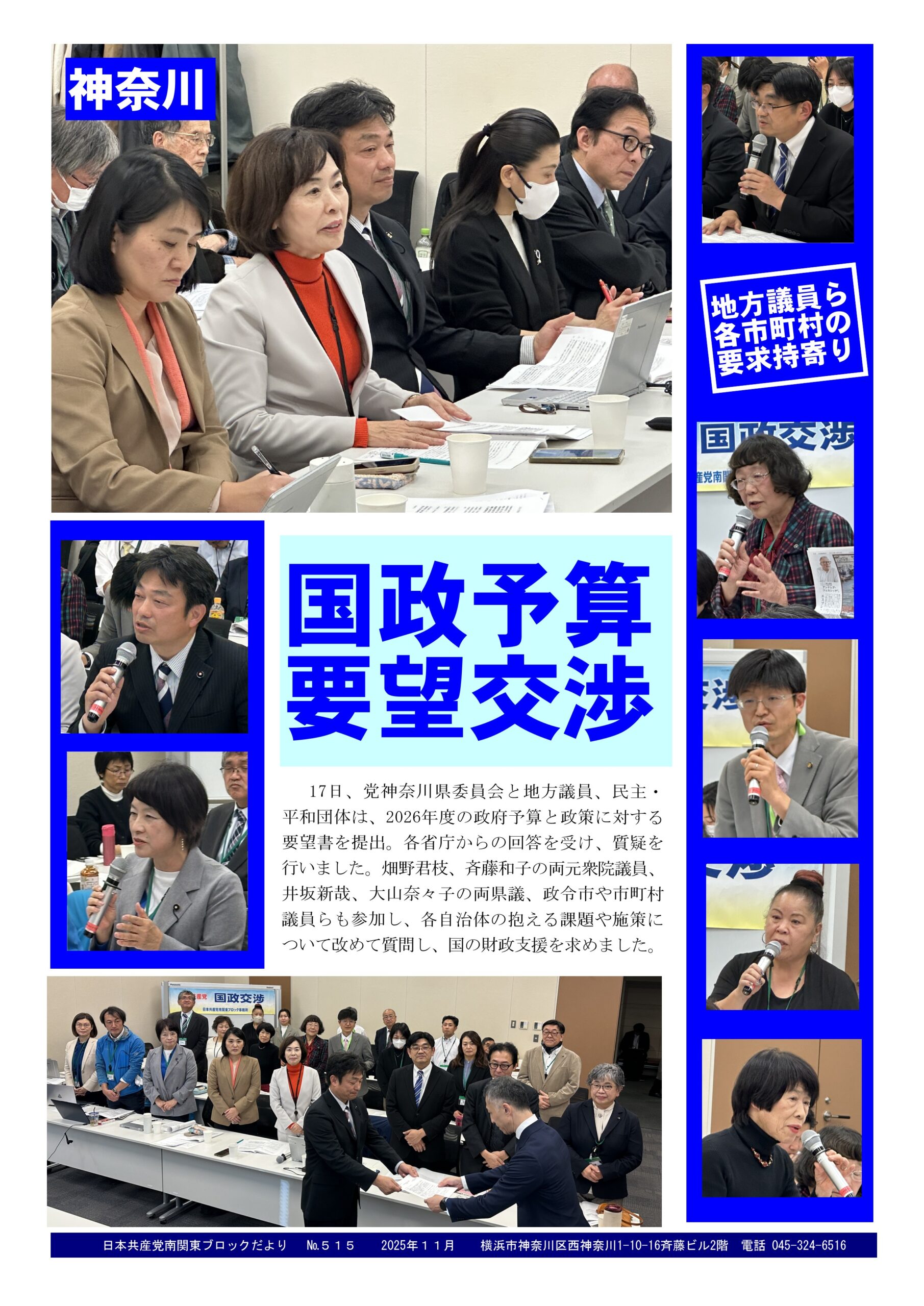19Nov2025日本共産党南関東ブロックだより 515号2025年11月19日南関東ブロック事務所だより日本共産党南関東ブロックだより №515を発行。 内容は…党神奈川県委員会と地方議員、民主・平和団体は、2026年度政府予算に対する要望書を提出し、各省庁と交渉しました。畑野君枝、斉藤和子の両元衆院議員も参加ました。