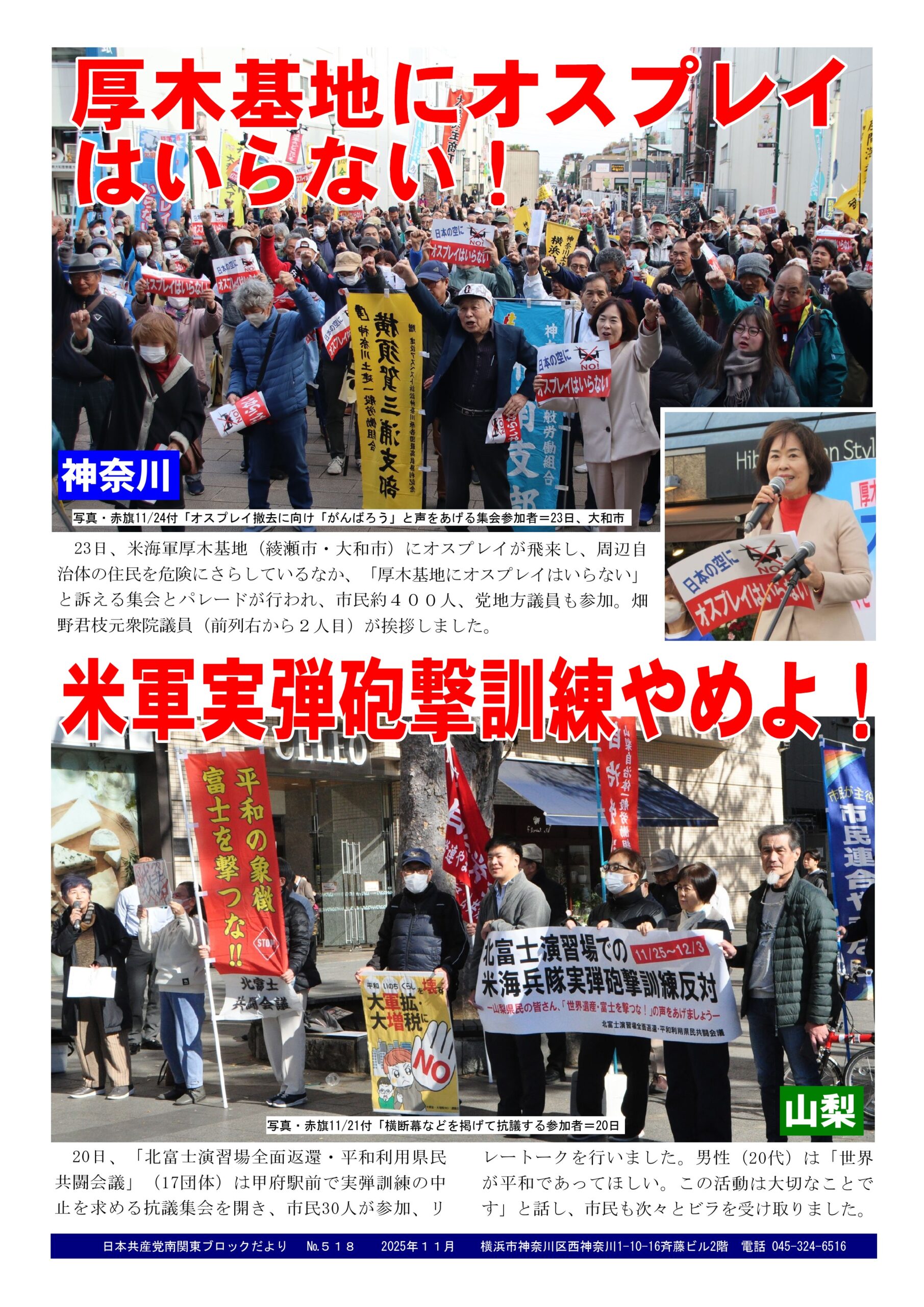 28Nov2025日本共産党南関東ブロックだより 518号2025年11月28日南関東ブロック事務所だより未分類日本共産党南関東ブロックだより №518を発行。 内容は…①23日、「厚木基地にオスプレイしいらい」の集会とパレードを行ない、畑野君枝元衆院議員が挨拶しました。②20日、「北富士演習場全面返還・平和利用市民共闘会議」が、甲府駅前で、実弾訓練の中止を求める集会を行いました。