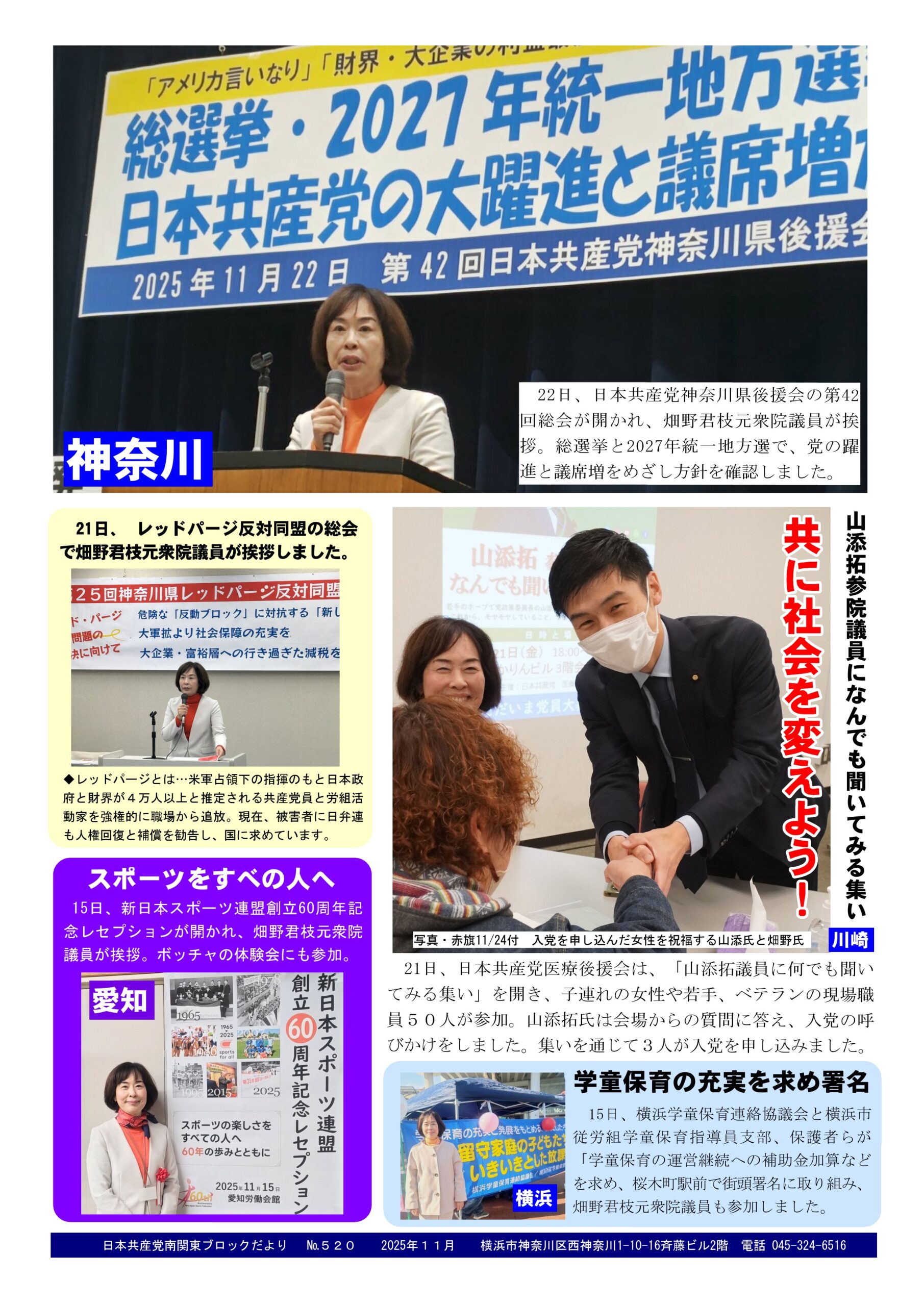 28Nov2025日本共産党南関東ブロックだより 520号2025年11月28日南関東ブロック事務所だより日本共産党南関東ブロックだより №520を発行。 内容は…①党県後援会が総会、畑野君枝元衆院議員が挨拶。②医療後援会が「山添拓参院議員になんでも聞いてみる」集いを行ない、3人が入党。③学童保育の充実を求めて街頭署名。④レッドパージ反対同盟総会。⑤新日本スポーツ連盟の創立60周年レセプション(愛知県)に畑野君枝元衆院議員が参加、挨拶しました。