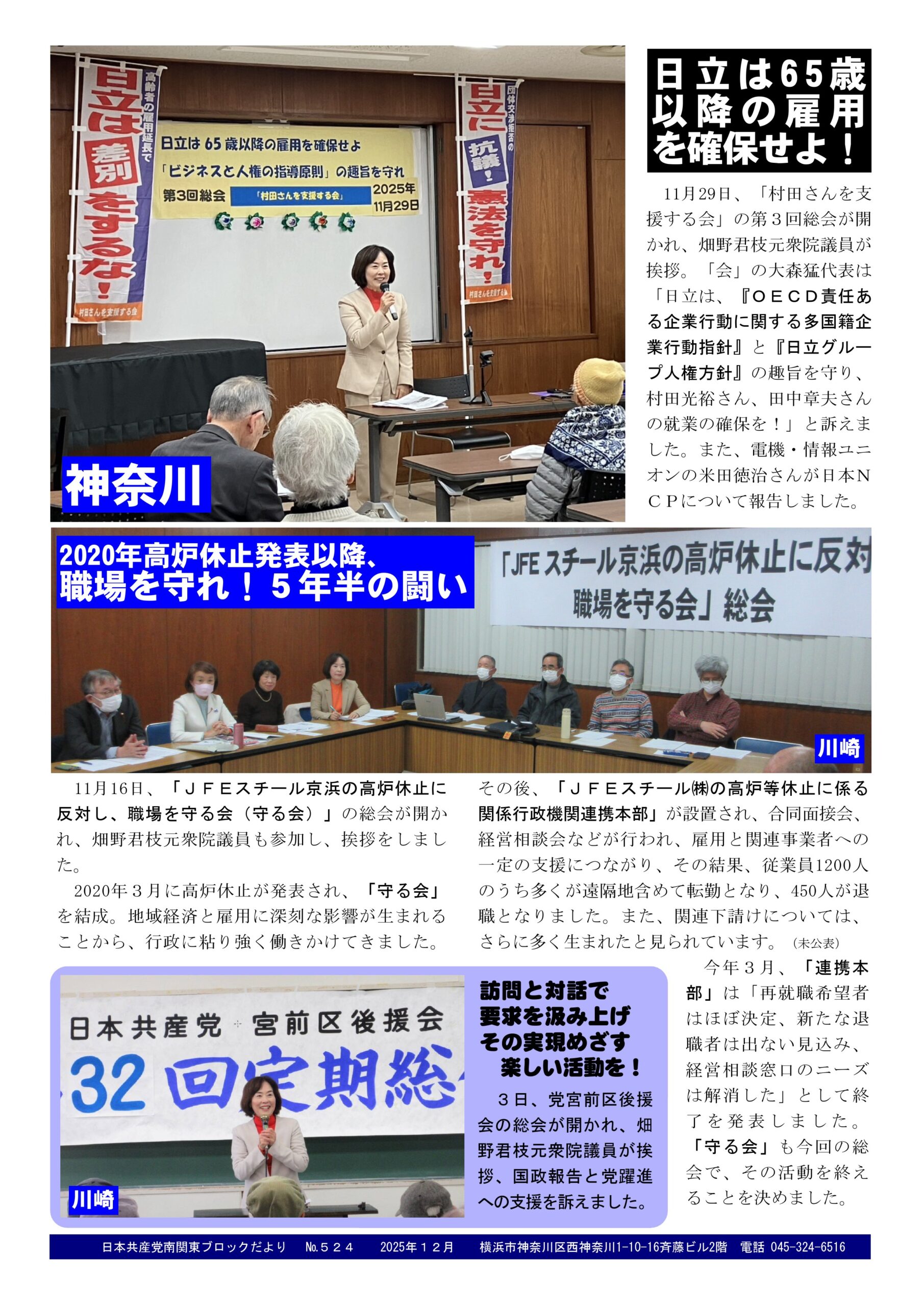 8Dec2025日本共産党南関東ブロックだより 524号2025年12月8日南関東ブロック事務所だより日本共産党南関東ブロックだより №524を発行。 内容は…①日立の65歳以上の雇用確保を求めるている「村田さんの支援する会」が総会。②「JFEスチール京浜の高炉休止に反対し、職場を守る会」が総会、5年半活動を経て活動を終える。③党宮前区後援会の総会で畑野君枝元衆院議員が国政報告しました。
