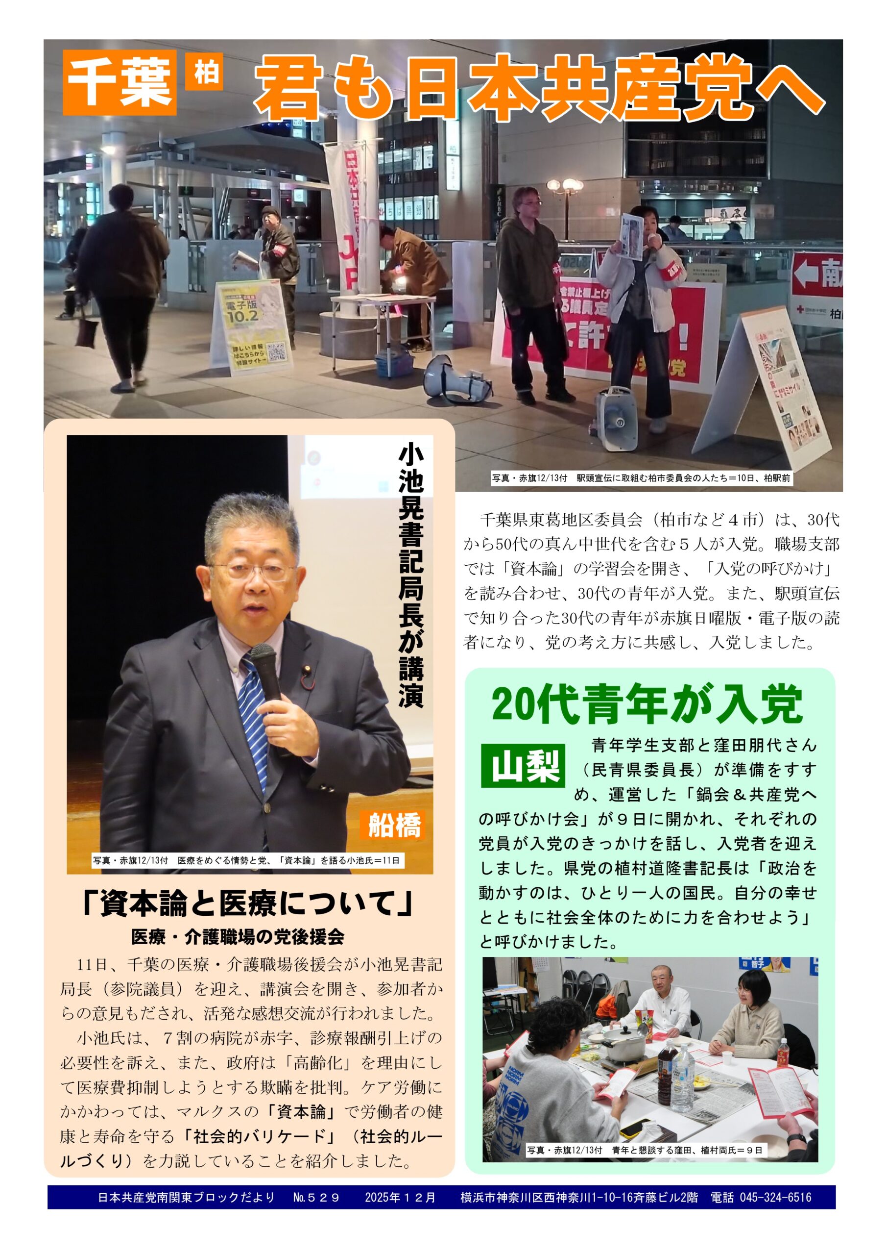 25Dec2025日本共産党南関東ブロックだより 529号2025年12月25日南関東ブロック事務所だより日本共産党南関東ブロックだより №529と発行。 内容は…①千葉で医療・介護職場後援会が、小池晃書記局長を迎え、「資本論と医療」の講演会を開く。②山梨の青年学生支部が「鍋&共産党への呼びかけ会」を開き、20代の青年が入党。③千葉・東葛地区委員会が宣伝、入党者も生まれる。