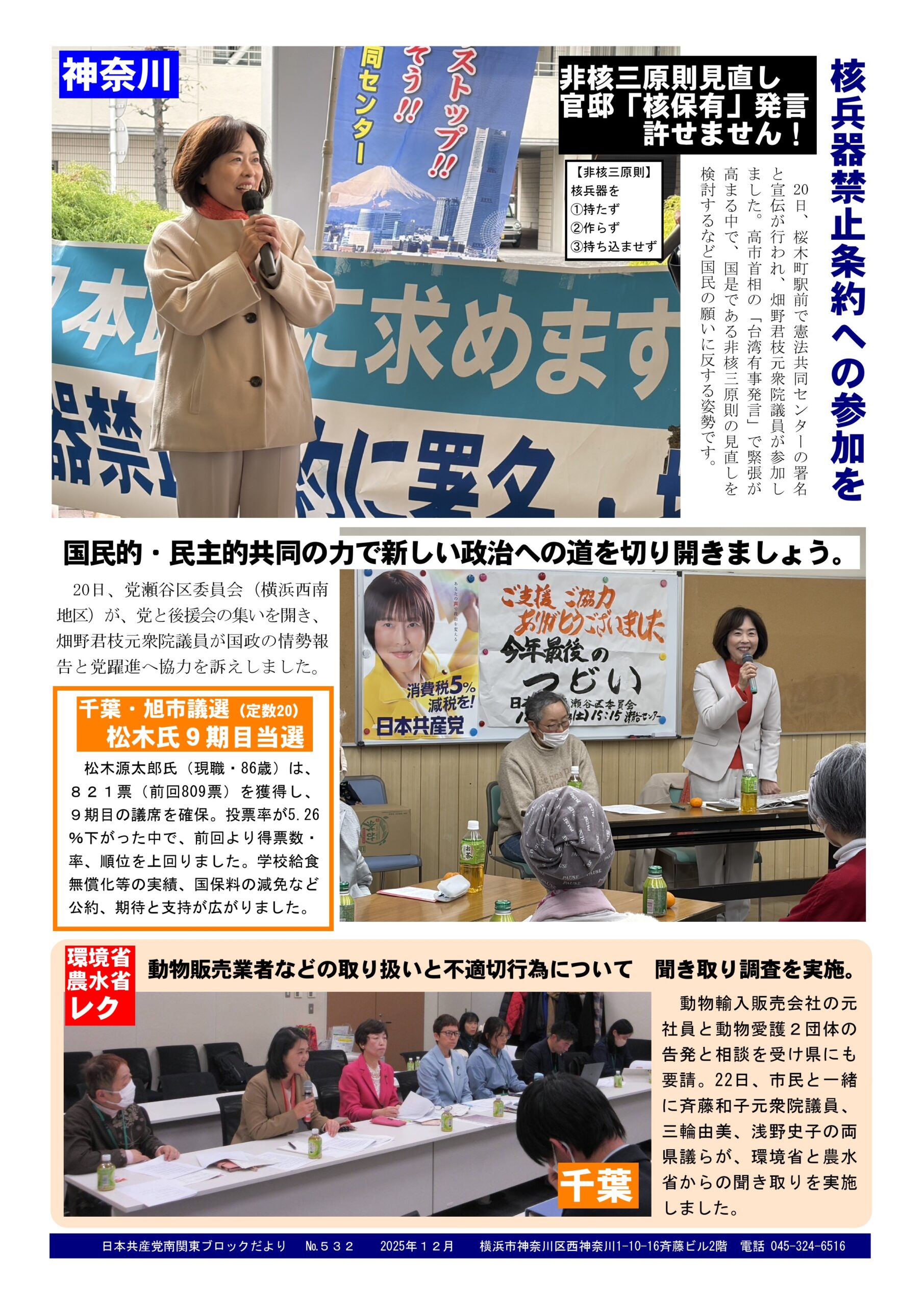 25Dec2025日本共産党南関東ブロックだより 532号2025年12月25日南関東ブロック事務所だより本共産党南関東ブロックだより №532を発行。 内容は…①桜木町駅前で、憲法共同センターが署名と宣伝。畑野君枝元衆院議員も参加。②横浜市瀬谷区の党と後援会がつどいを開催。③千葉・旭市議選で松木源太郎氏が当選。④動物販売業者等の動物取り扱いと不適切行について、環境省と農水省から聞き取りを行ないました。市民と一緒に斉藤和子元衆院議員、三輪由美、浅野史子の両県議が参加しました。
